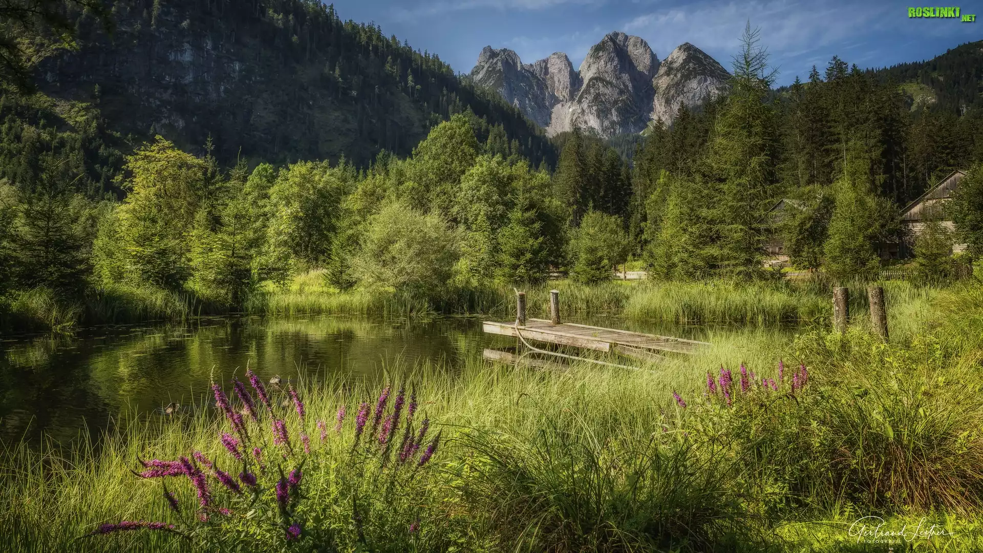 Rośliny: Góry, Jezioro, Kładka, Drzewa, Szuwary