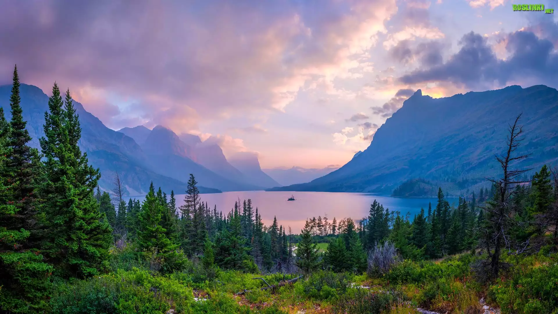 Rośliny: Park Narodowy Glacier, Jezioro, Saint Mary Lake, Góry, Drzewa, Krzewy, Niebo, Stany Zjednoczone
