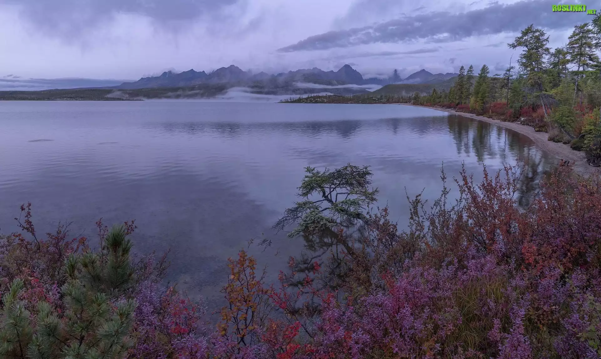 Rośliny: Jezioro, Góry, Mgła, Krzewy, Drzewa