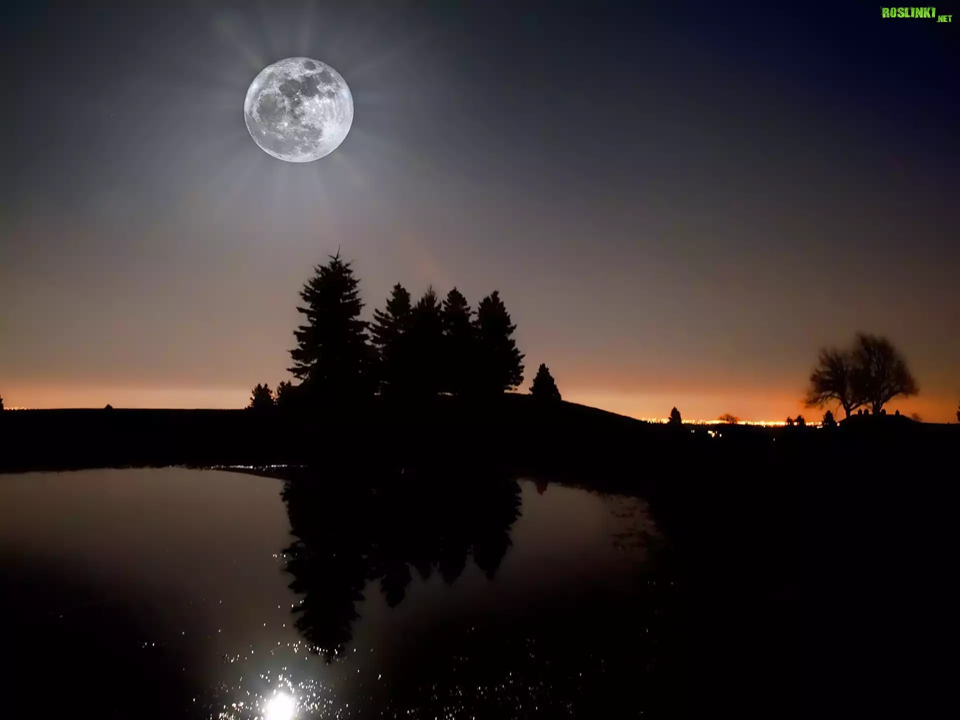 Rośliny: Jezioro, Drzewa, Noc, Księżyc, Odbicie