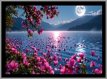 Jezioro, Góry, Noc, Księżyc, Rośliny, Czerwone, Kwiaty, Kwitnące, Drzewo