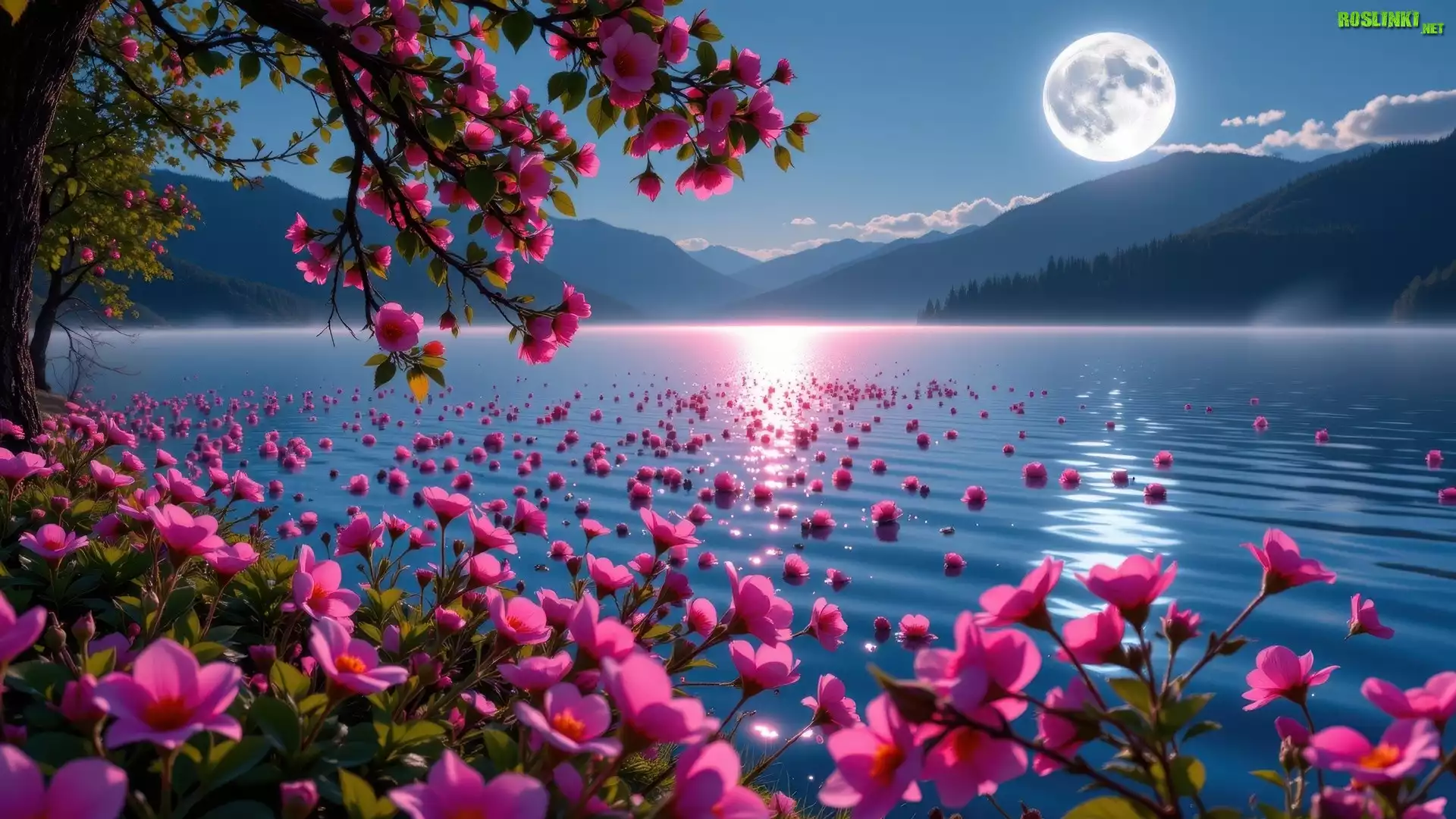 Rośliny: Jezioro, Góry, Noc, Księżyc, Rośliny, Czerwone, Kwiaty, Kwitnące, Drzewo