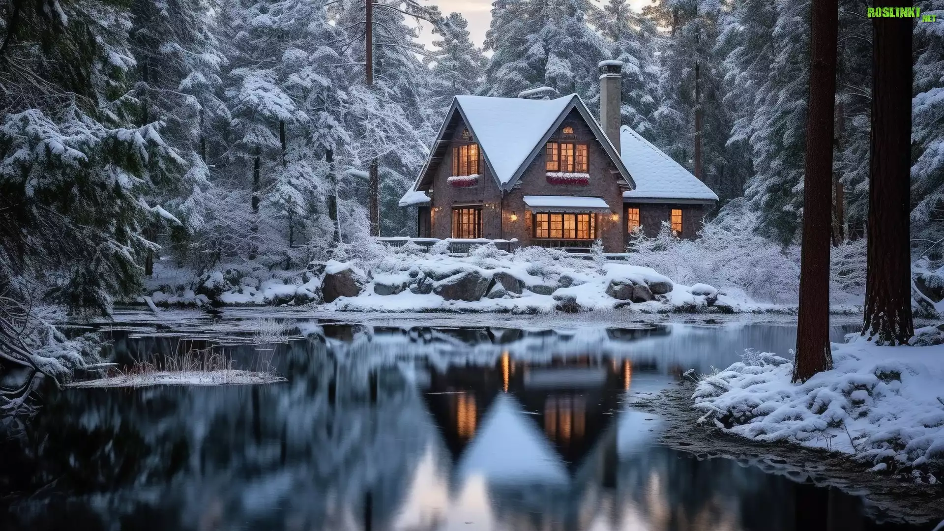 Rośliny: Zima, Śnieg, Las, Ośnieżone, Drzewa, Dom, Oświetlony, Jezioro