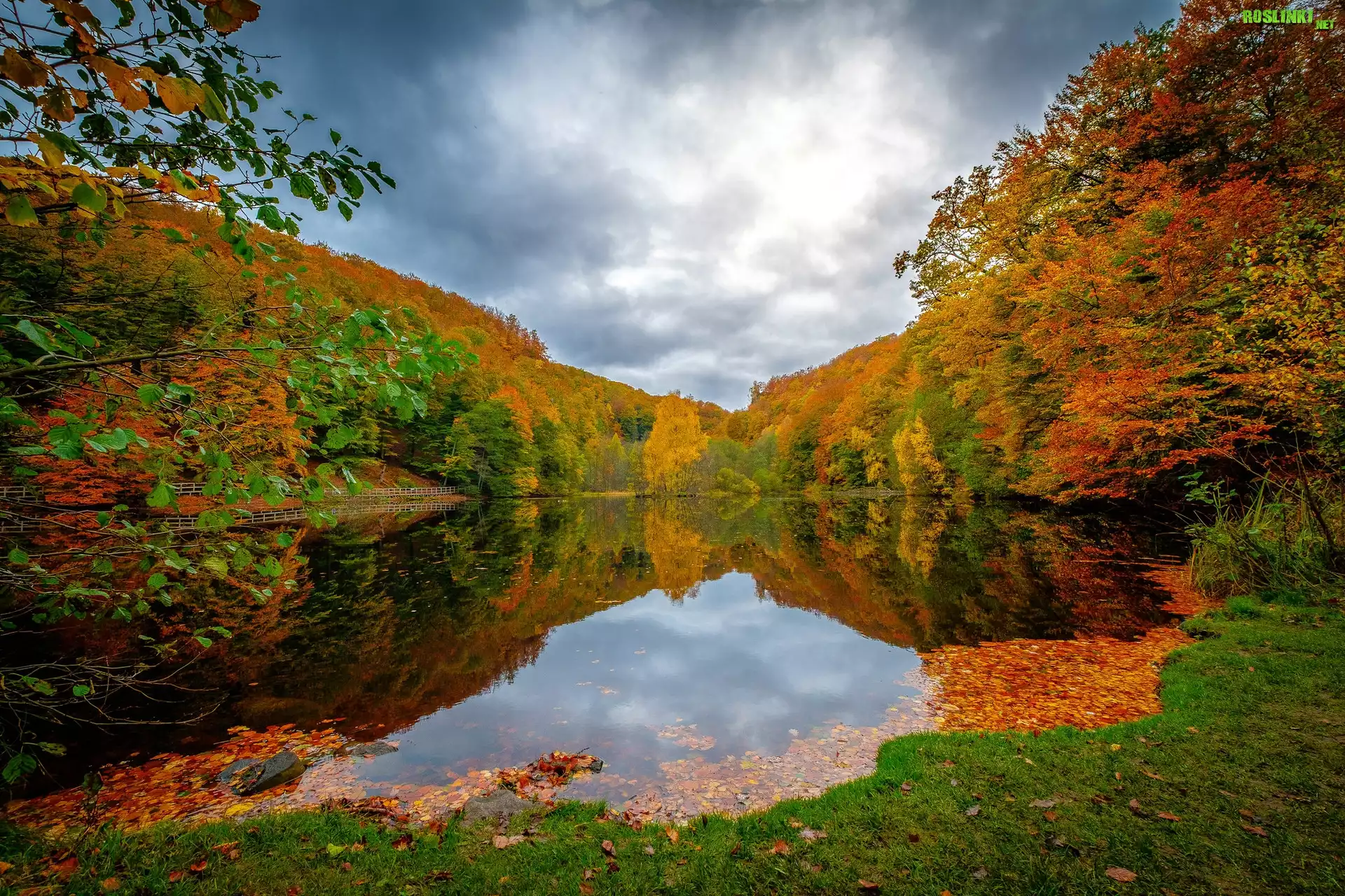 Rośliny: Jezioro, Jesień, Drzewa, Liście, Chmury