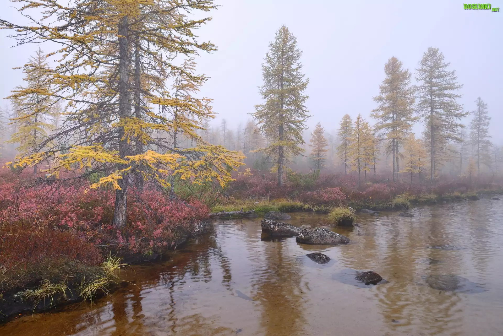 Rośliny: Drzewa, Krzewy, Jezioro Jack London, Kamienie, Mgła, Kołyma, Obwód magadański, Rosja
