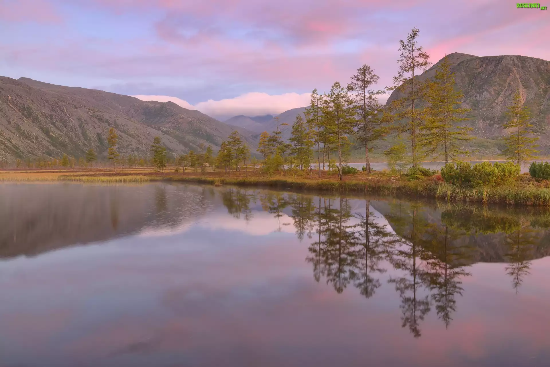 Rośliny: Góry Kołymskie, Jezioro Jack London, Drzewa, Odbicie, Kołyma, Obwód magadański, Rosja
