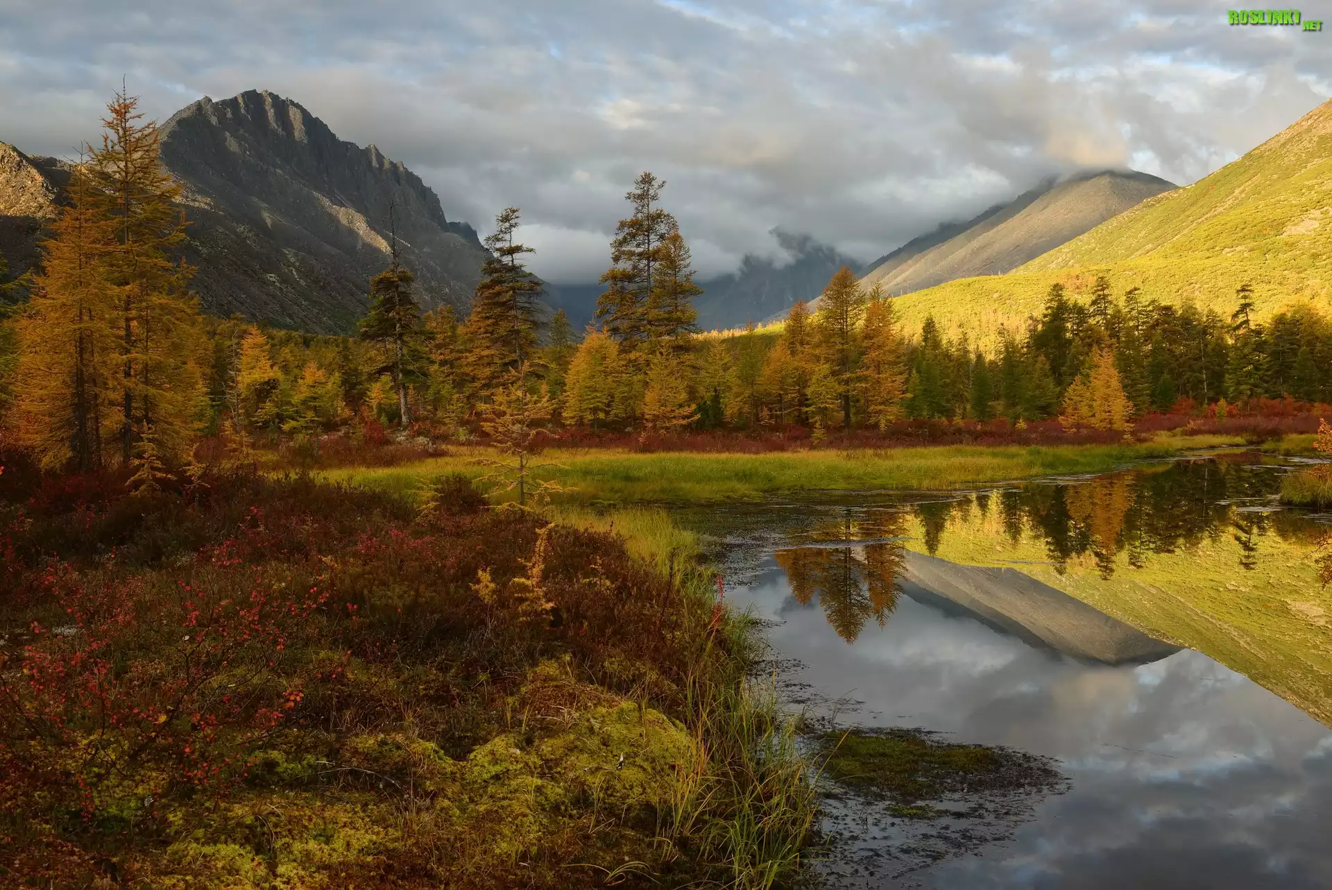 Rośliny: Góry, Drzewa, Jezioro Jack London, Odbicie, Jesień, Kołyma, Obwód magadański, Rosja