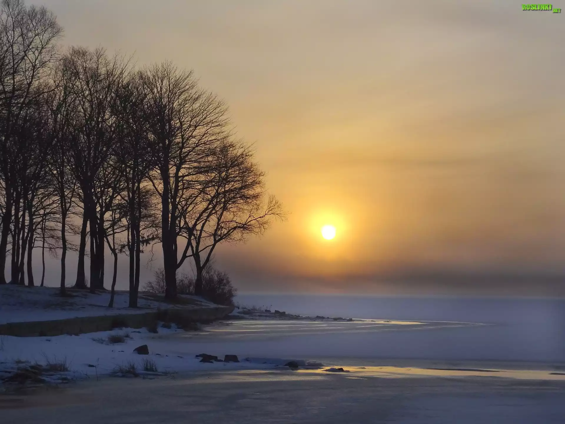 Rośliny: Jezioro, Drzewa, Mgła, Śnieg