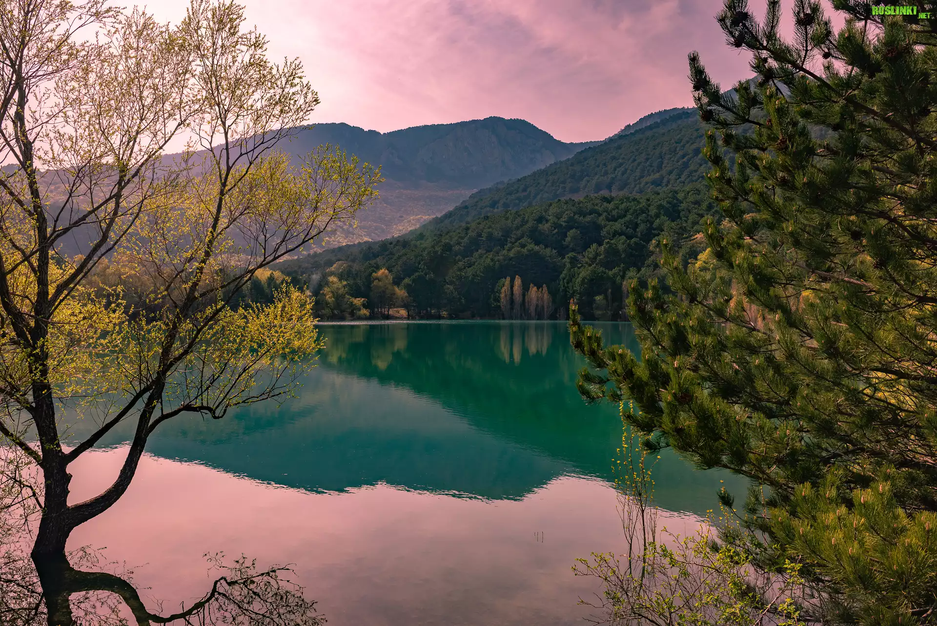 Rośliny: Jezioro, Las, Drzewa, Niebo, Góry
