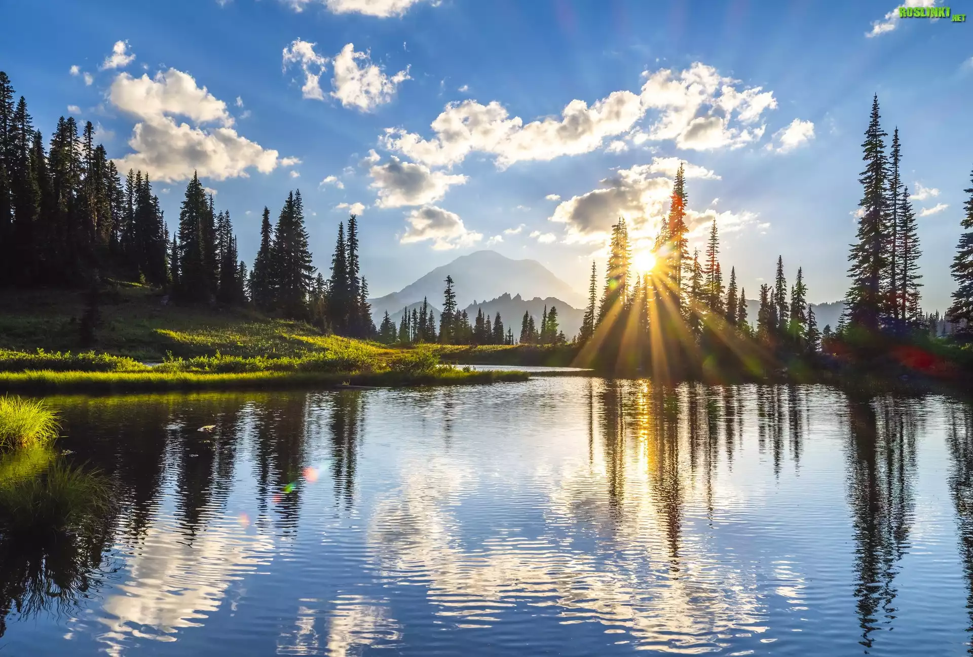 Park Narodowy Mount Rainier, Góry, Drzewa, Jezioro, Tipsoo Lake, Niebo, Zachód słońca, Stan Waszyngton, Stany Zjednoczone |