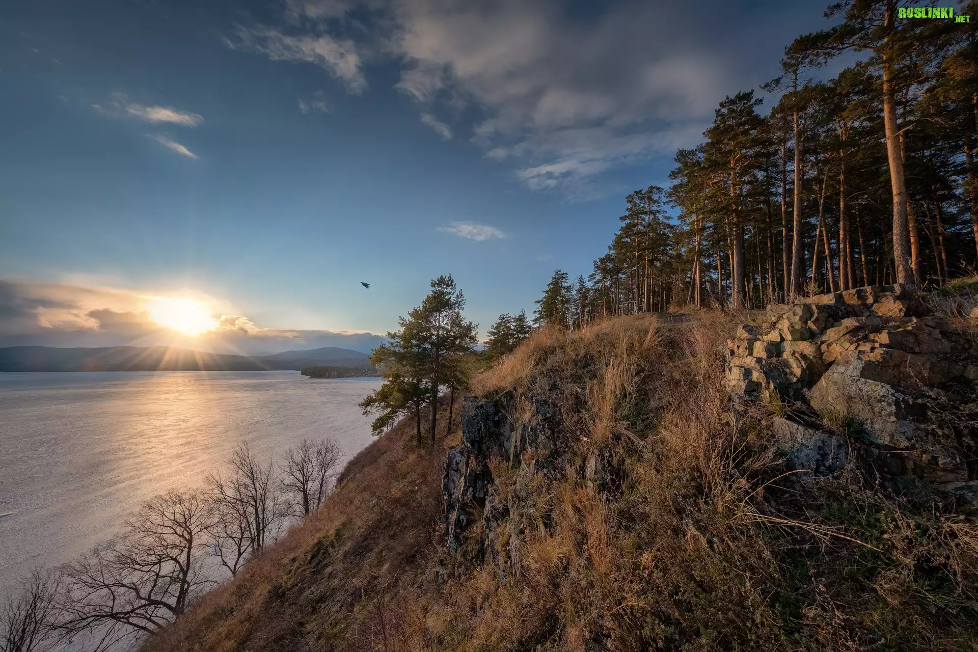 Rośliny: Wschód słońca, Jezioro Turgoyak, Niebo, Kamienie, Drzewa, Sosny, Obwód czelabiński, Rosja