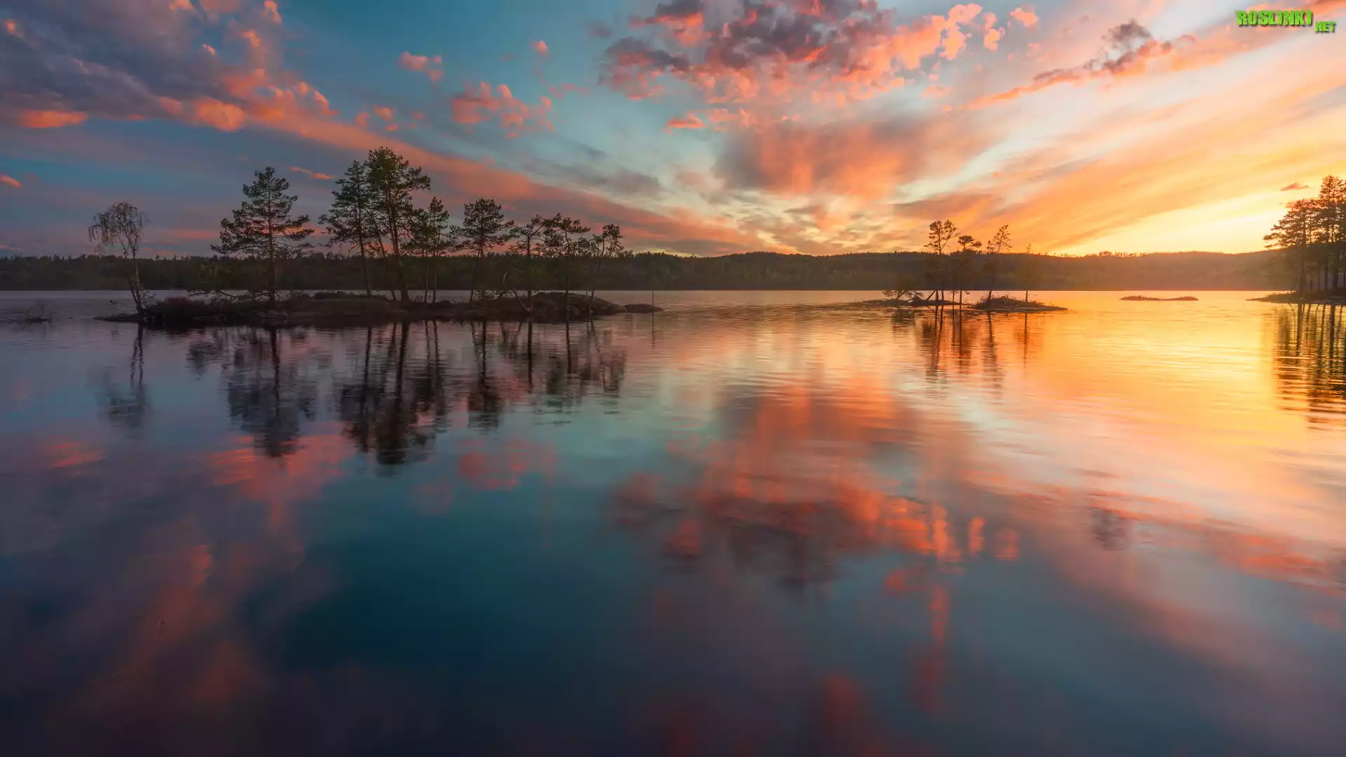 Wysepki, Jezioro, Drzewa, Zachód słońca, Chmury, Ringerike, Norwegia