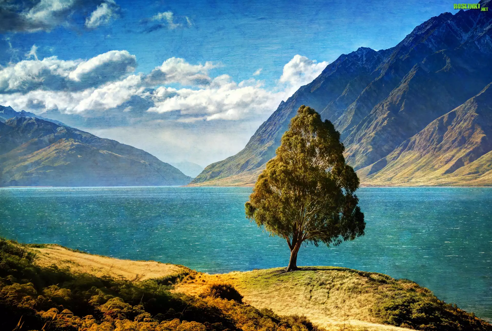 Jezioro, Drzewo, Góry, Hawea, Nowa Zelandia