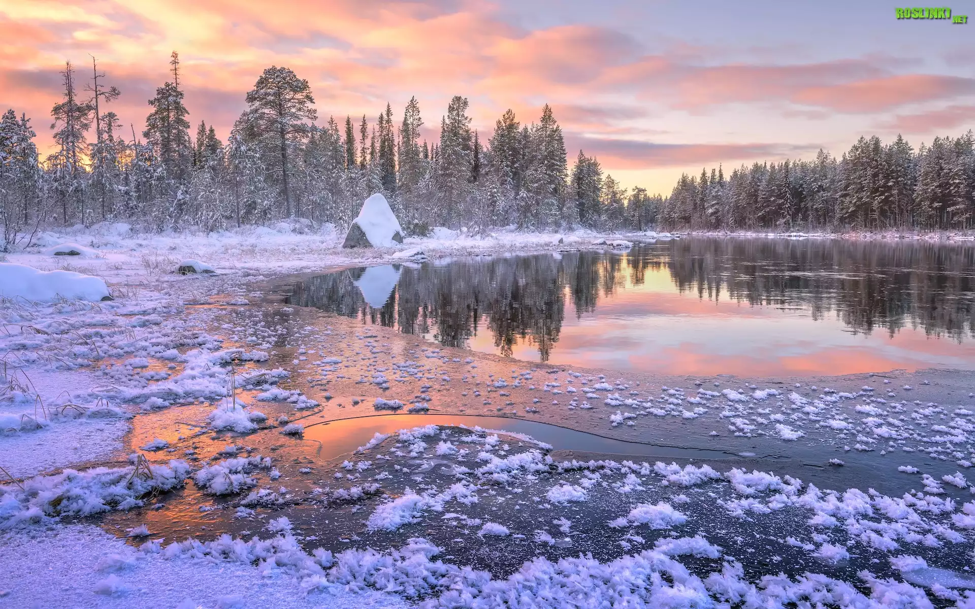 Rośliny: Zima, Jezioro, Oblodzone, Kry, Drzewa