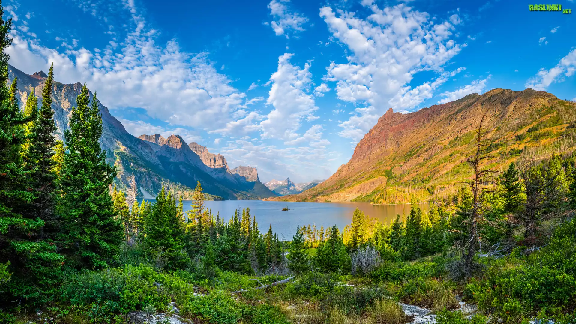 Rośliny: Park Narodowy Glacier, Jezioro, Saint Mary Lake, Góry, Drzewa, Obłoki, Montana, Stany Zjednoczone