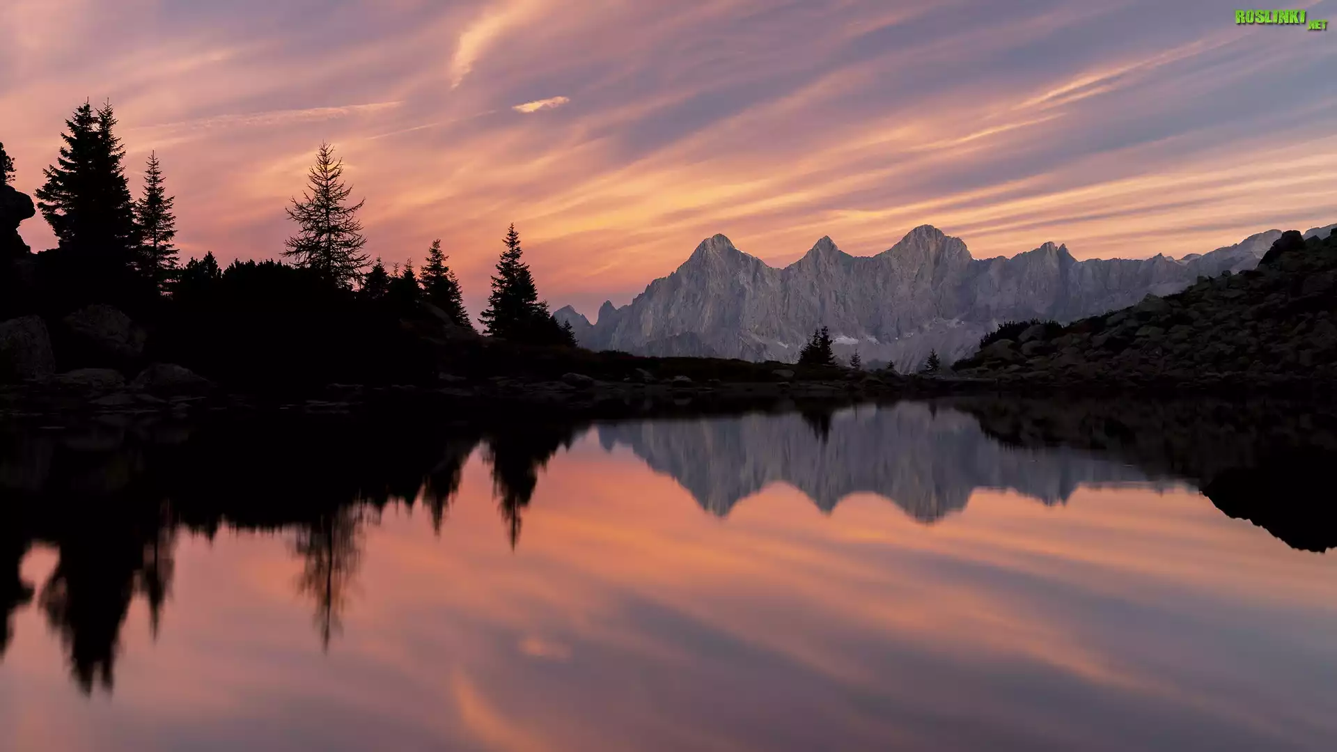 Rośliny: Zachód słońca, Góry, Jezioro, Drzewa, Odbicie