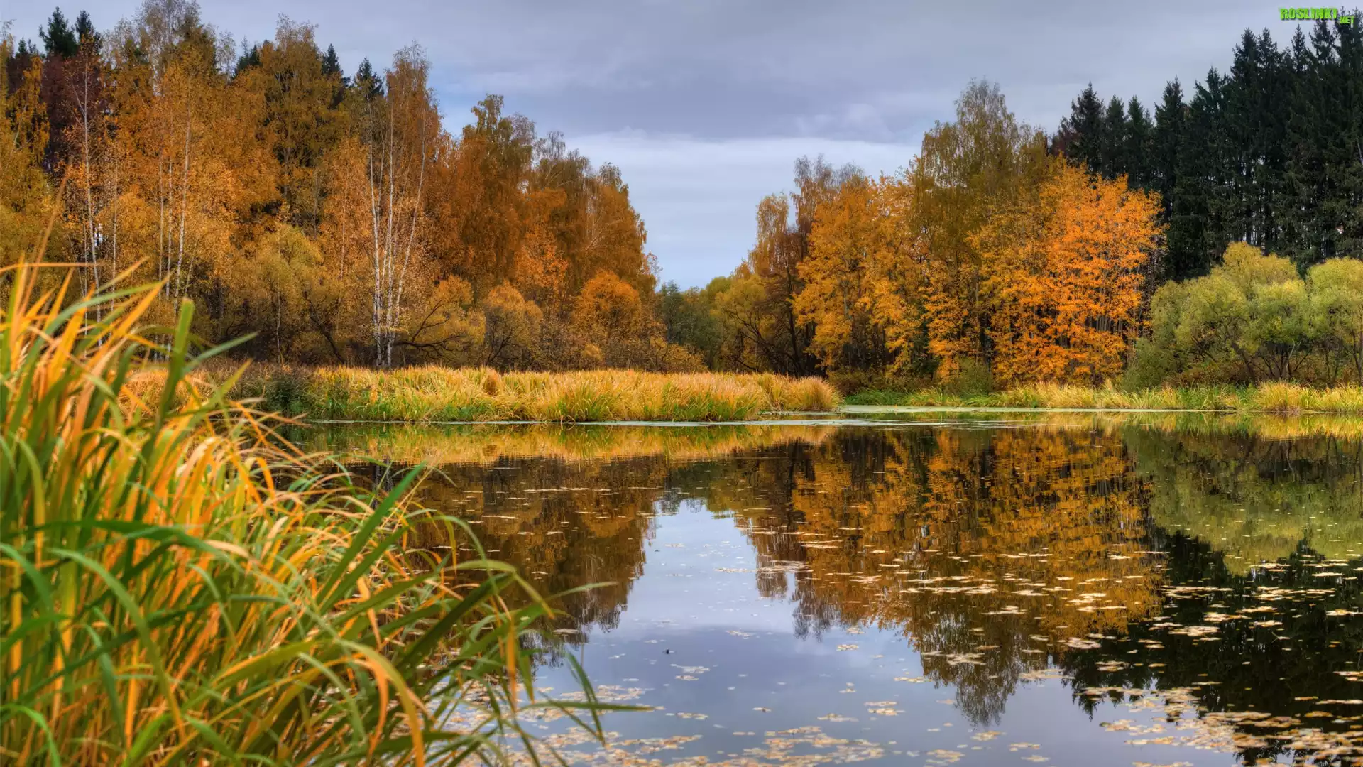 Rośliny: Jezioro, Drzewa, Las, Jesień, Odbicie, Trawa