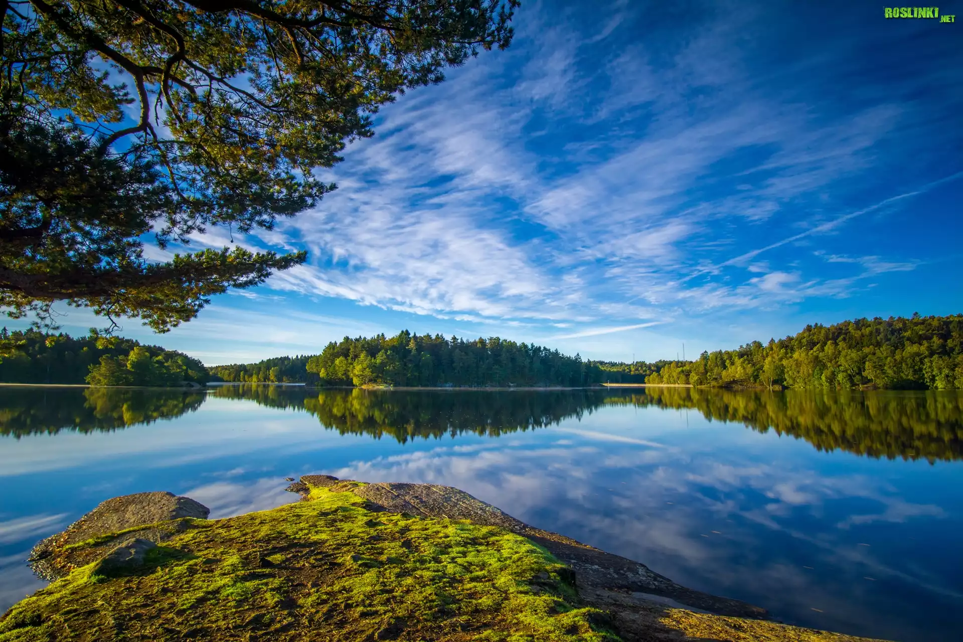 Rośliny: Jezioro, Omszała, Skała, Drzewa, Odbicie, Niebo