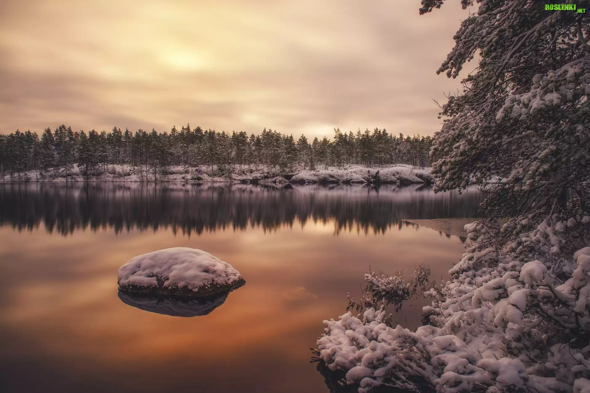 Rośliny: Zima, Jezioro, Kamień, Las, Ośnieżone, Drzewa, Zmierzch, Odbicie