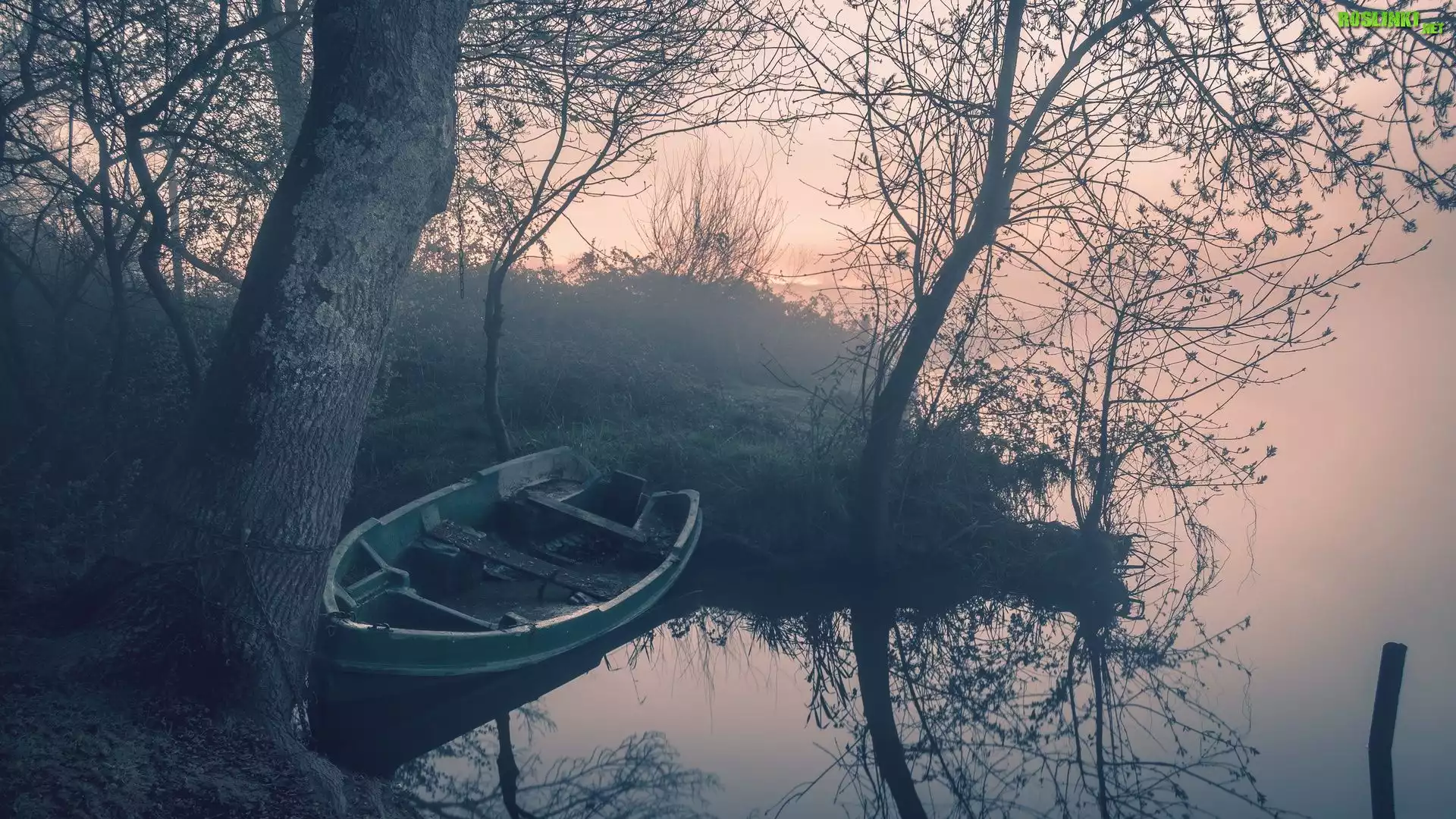 Rośliny: Jezioro, Mgła, Łódka, Drzewa