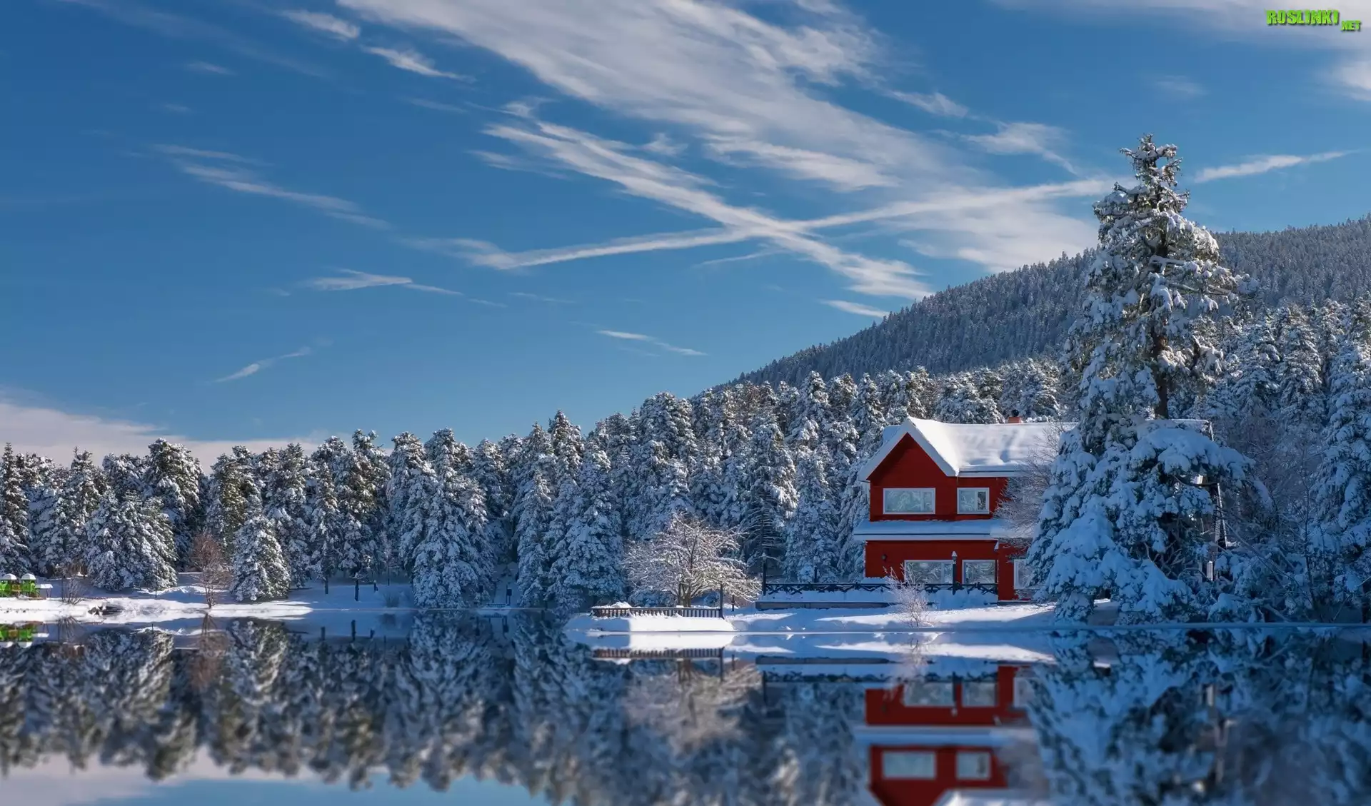 Rośliny: Jezioro, Zima, Domek, Ośnieżone, Drzewa