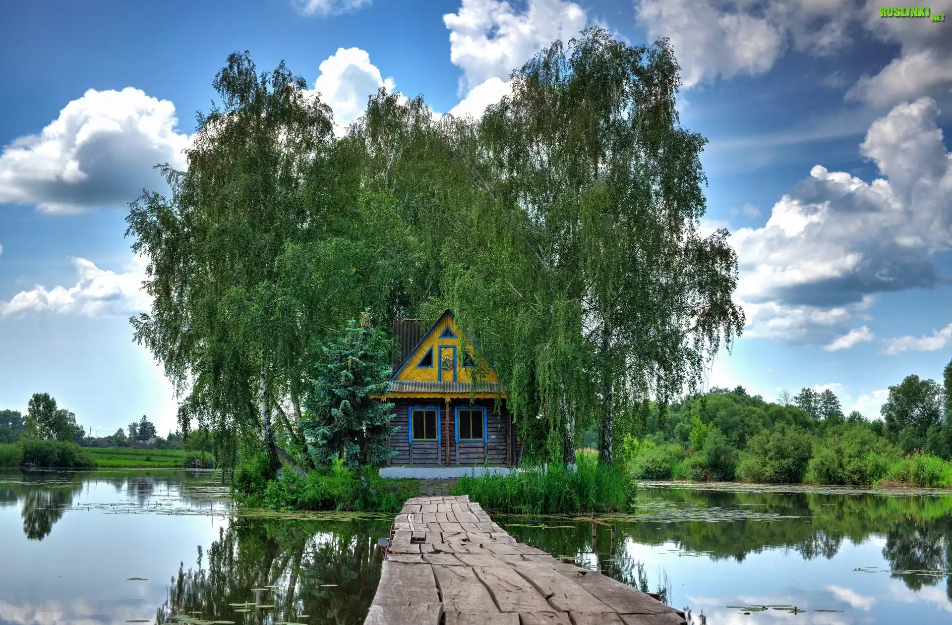 Rośliny: Jezioro, Drzewa, Dom, Pomost, Odbicie