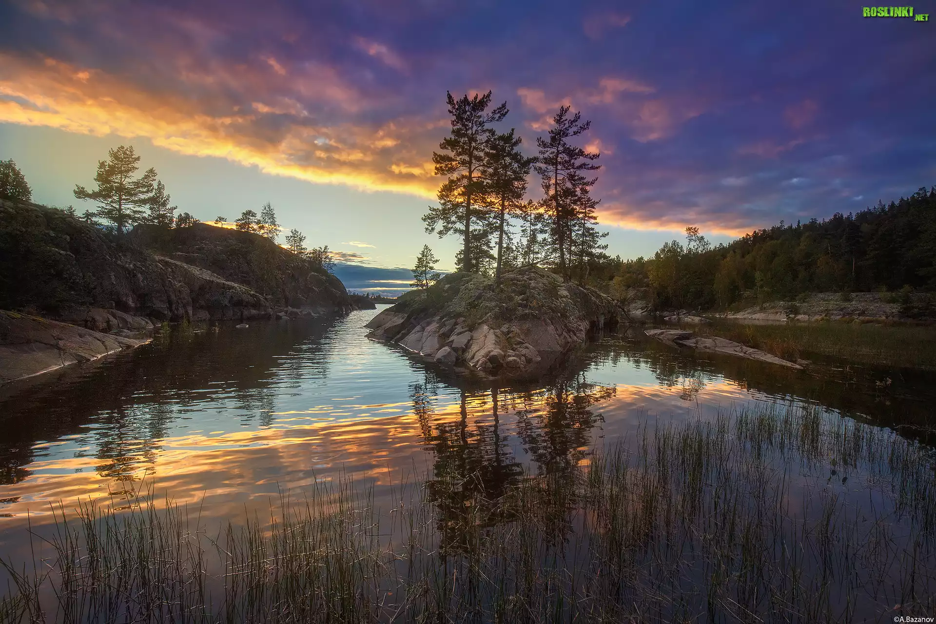 Rośliny: Rosja, Jezioro Ładoga, Skały, Niebo, Chmury, Drzewa