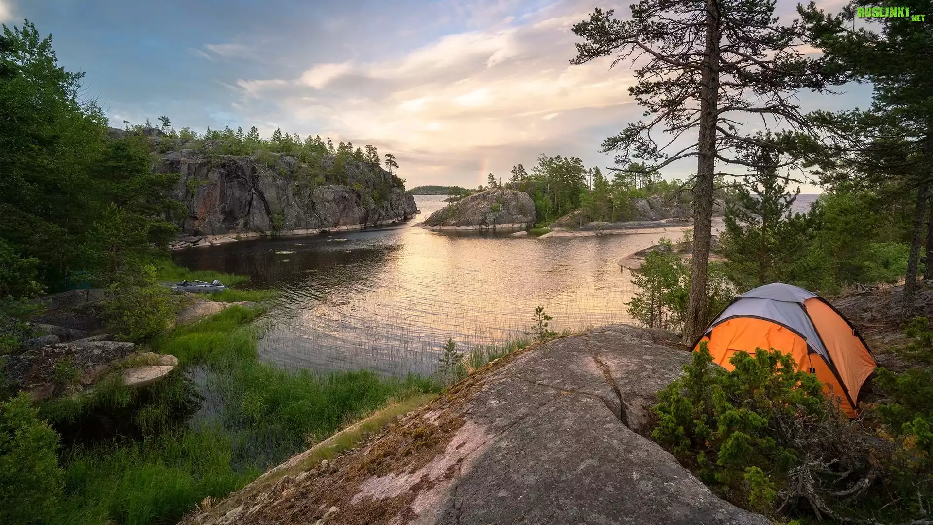 Rośliny: Jezioro, Namiot, Drzewa, Skały, Chmury