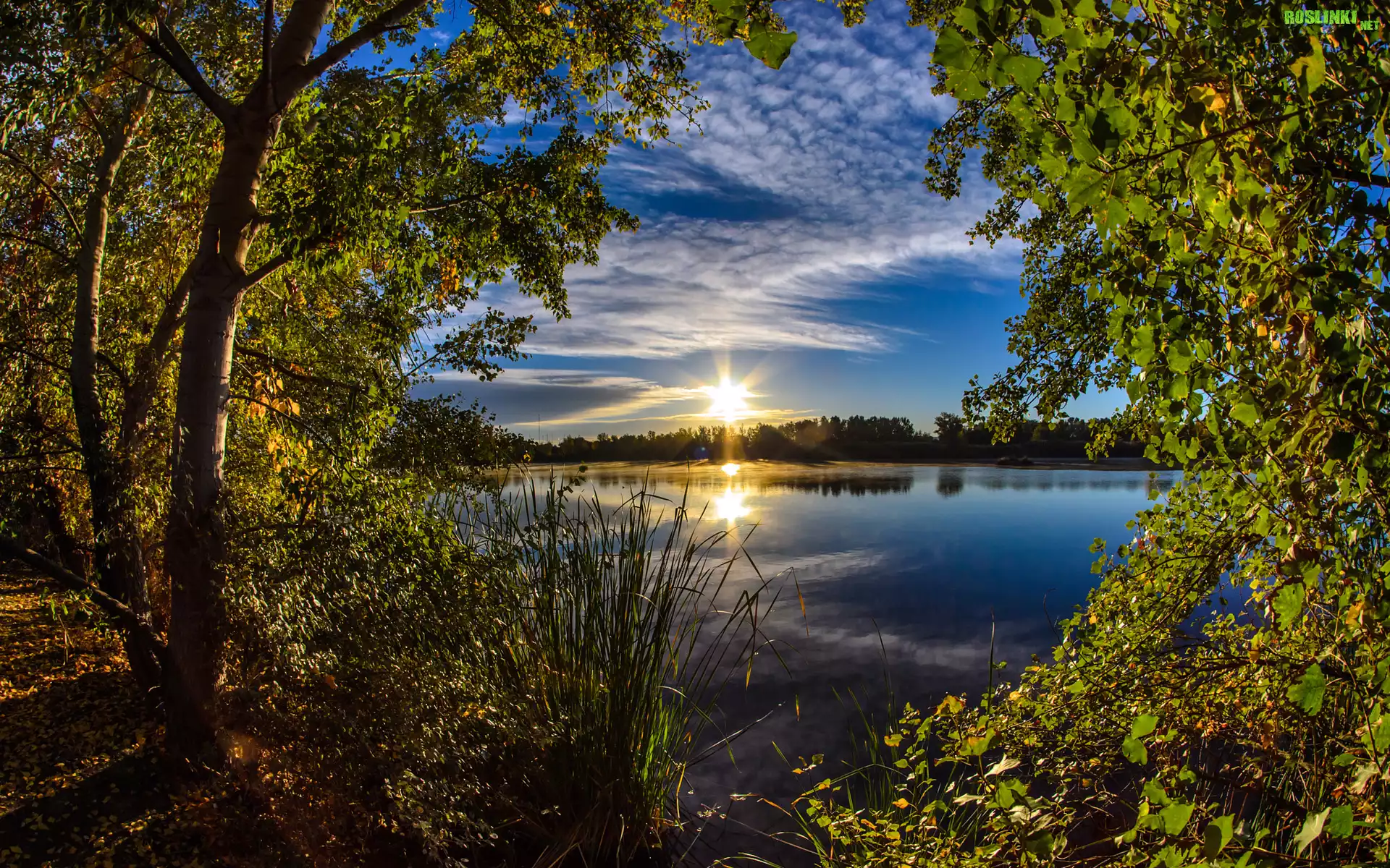 Rośliny: Jezioro, Las, Drzewa, Promienie słońca, Chmury