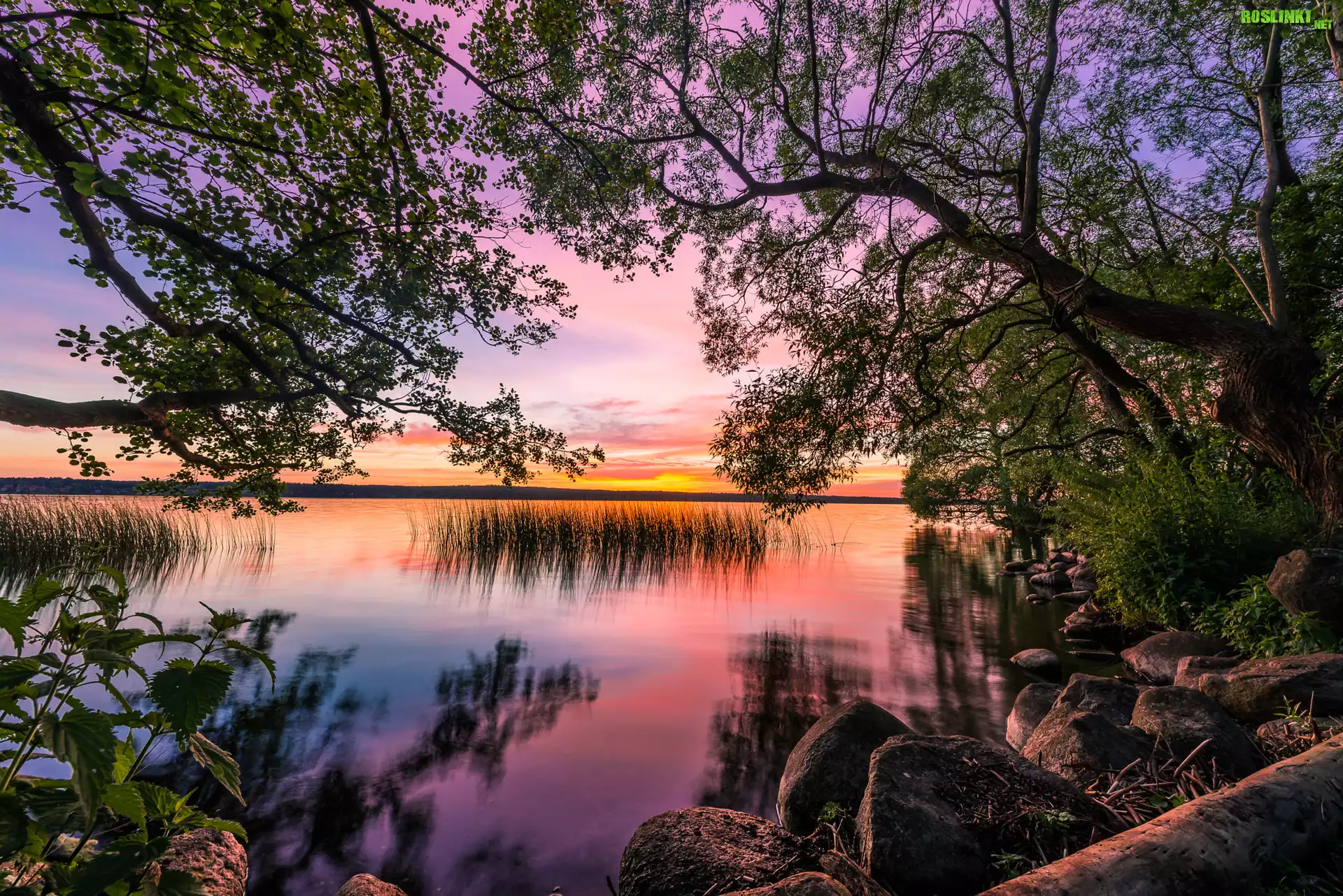 Rośliny: Jezioro, Drzewa, Kamienie, Zachód słońca, Odbicie