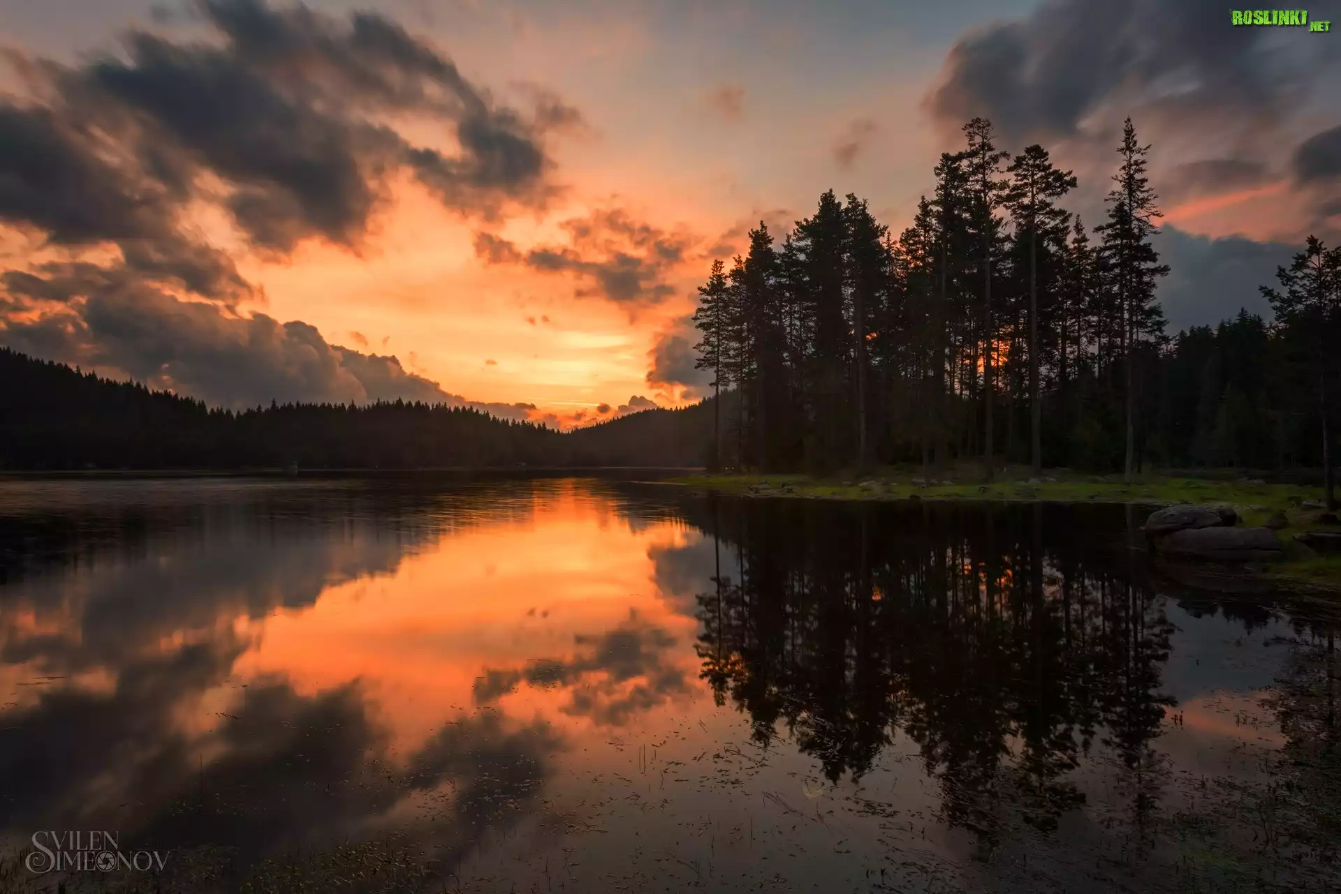Rośliny: Jezioro, Drzewa, Las, Zachód słońca, Chmury