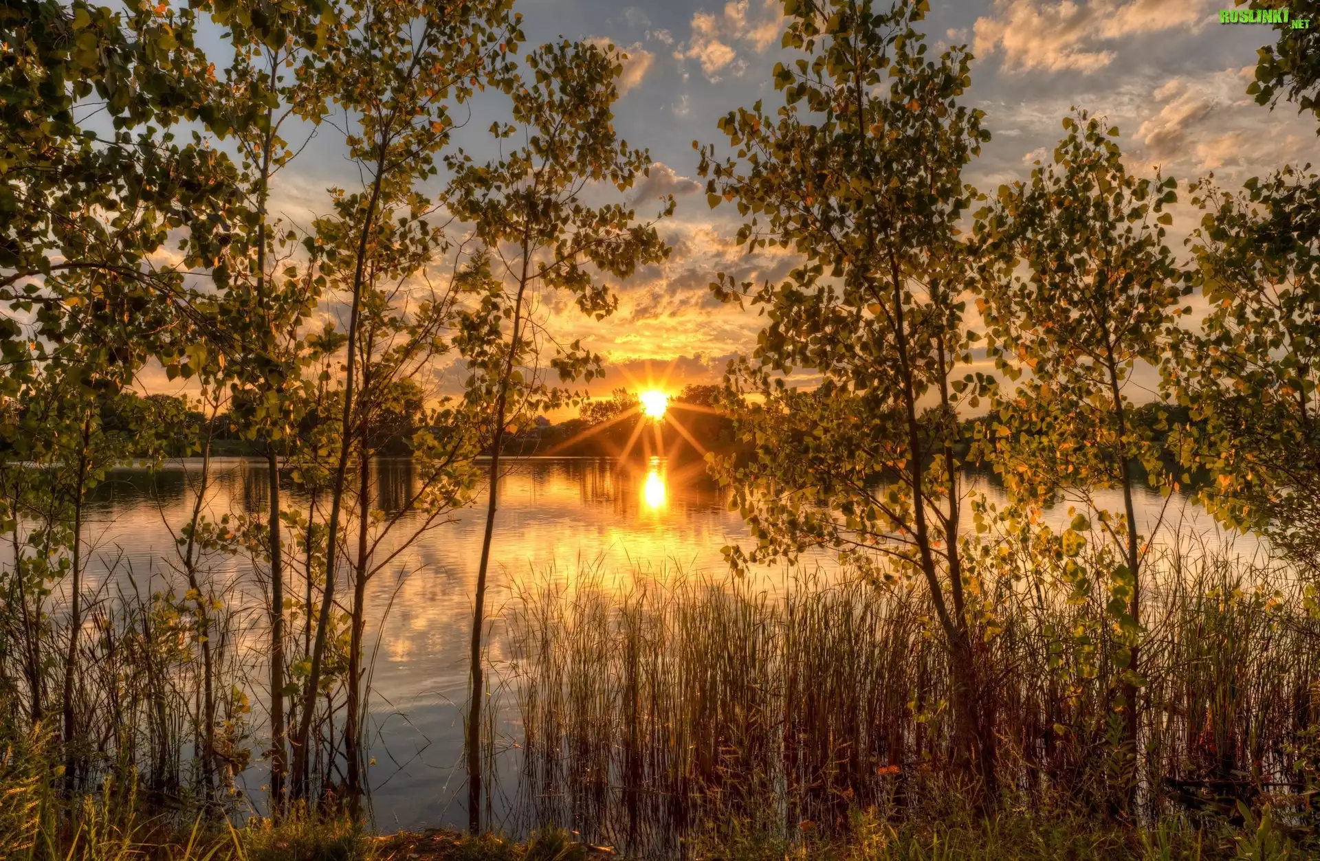 Rośliny: Jezioro, Drzewa, Roślinność, Wschód słońca, Promienie