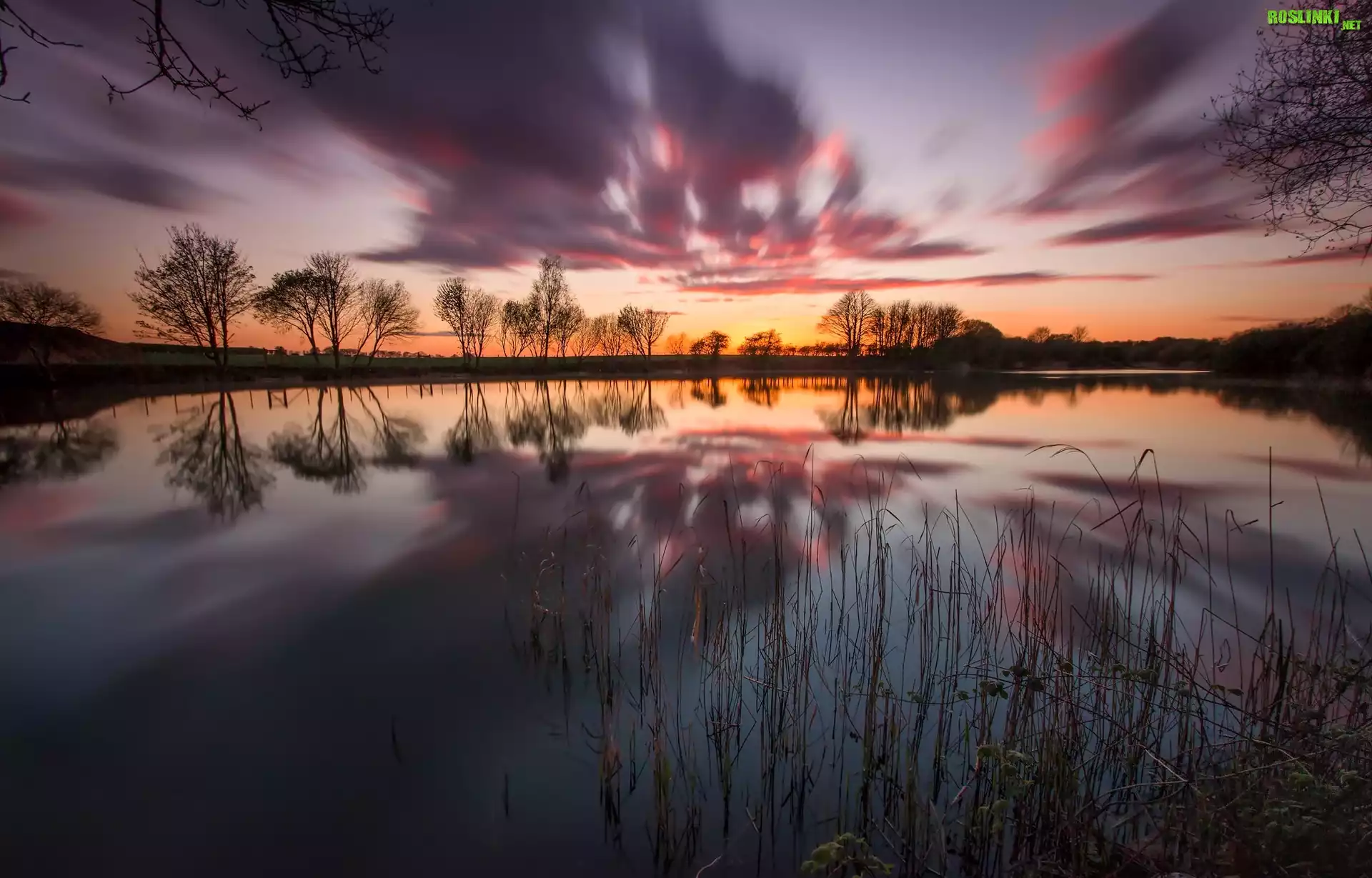 Rośliny: Jezioro, Drzewa, Trawa, Zachód, Słońca, Odbicie