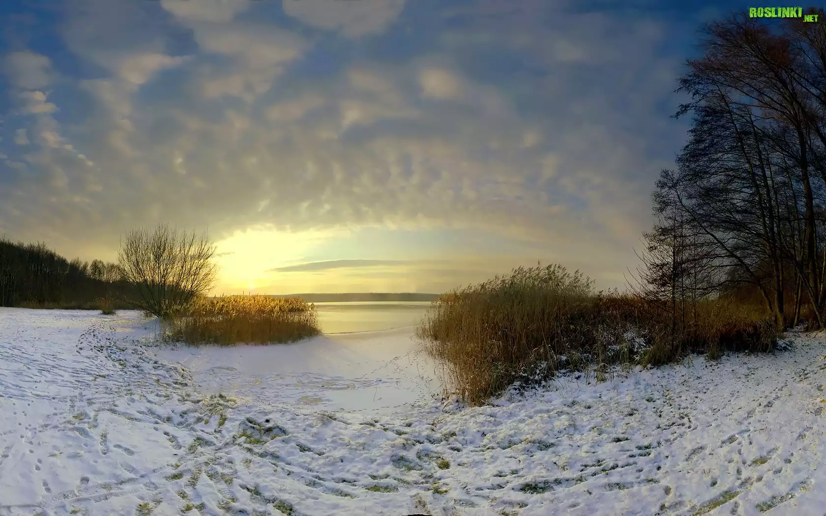 Rośliny: Jezioro, Lasy, Trawy, Zachód, Słońca, Zima