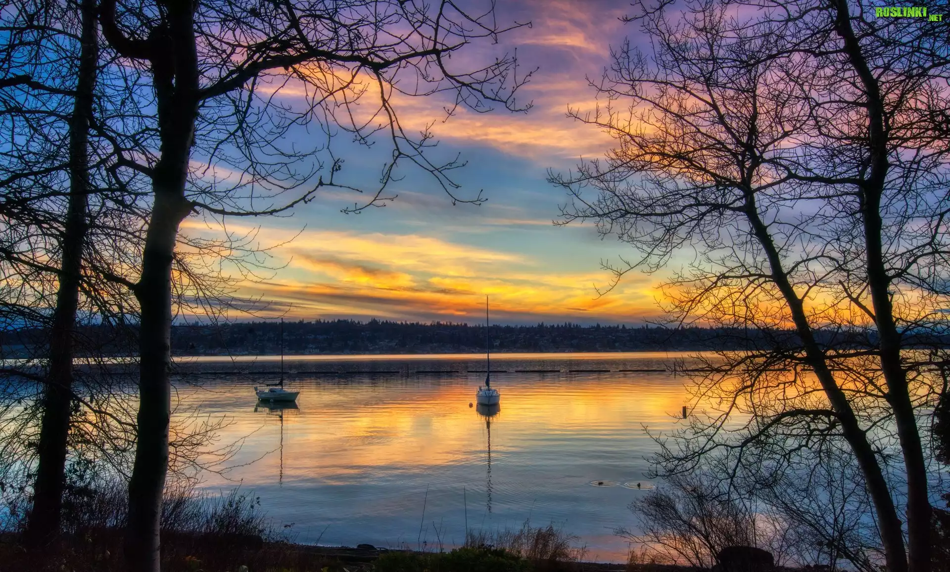 Rośliny: Jezioro, Drzewa, Wschód słońca, Żaglówki