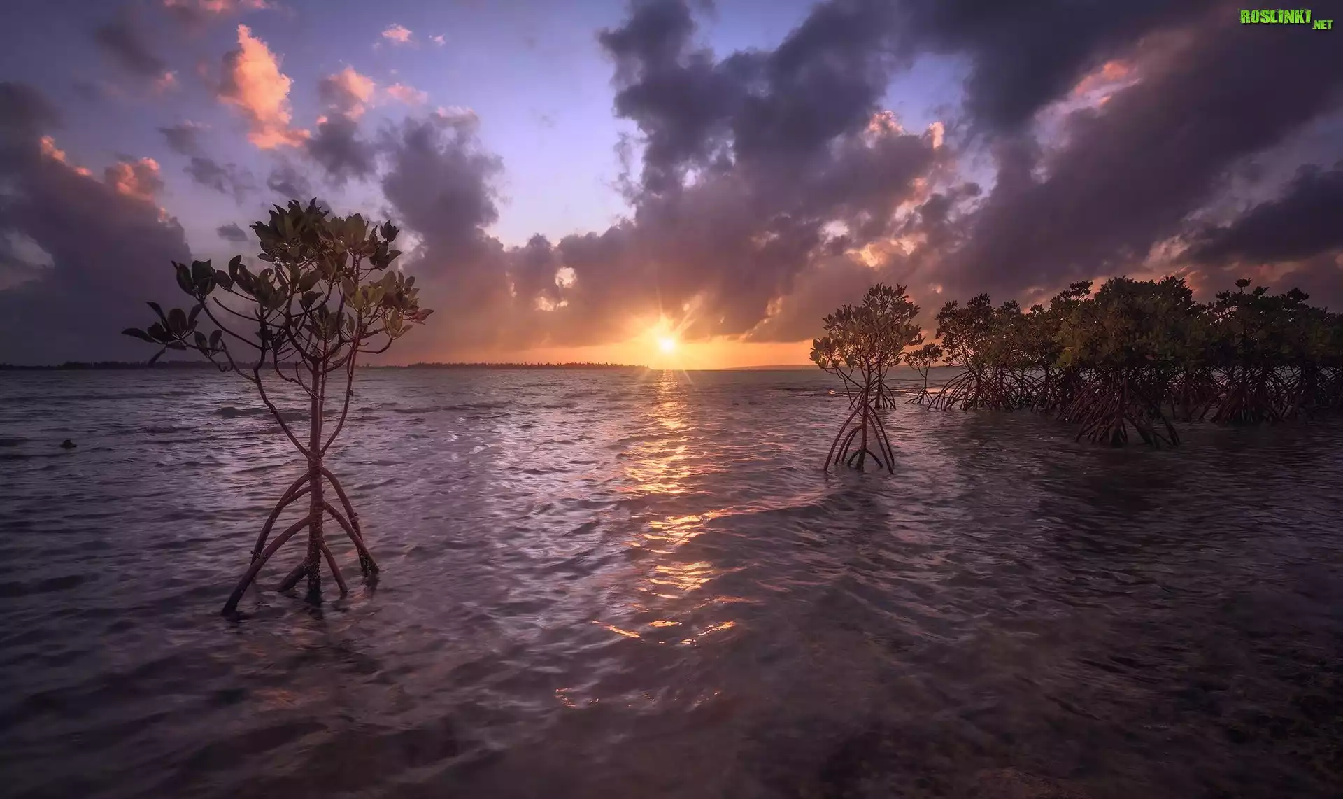Rośliny: Jezioro, Drzewa, Zachód słońca, Chmury