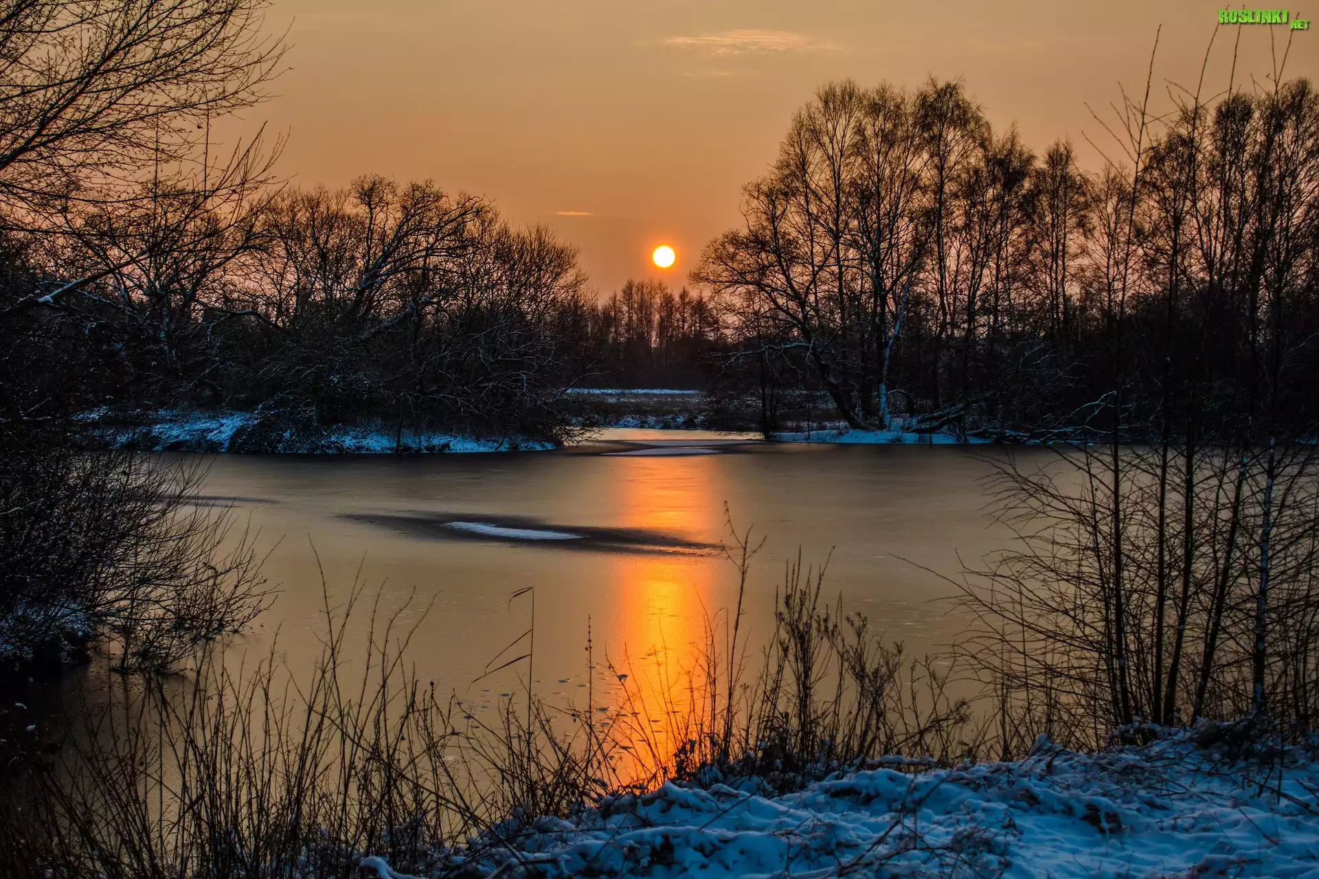 Jezioro, Drzewa, Zachód, Słońca, Śnieg