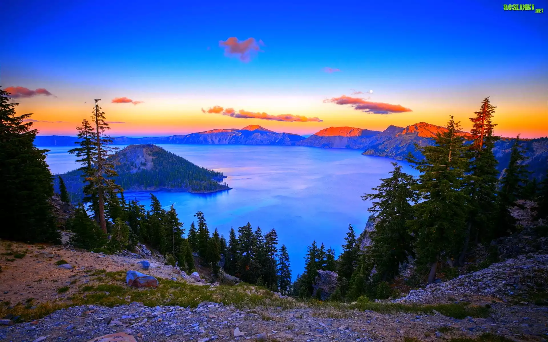 Rośliny: Jezioro, Wysepka, Zachód Słońca, Drzewa