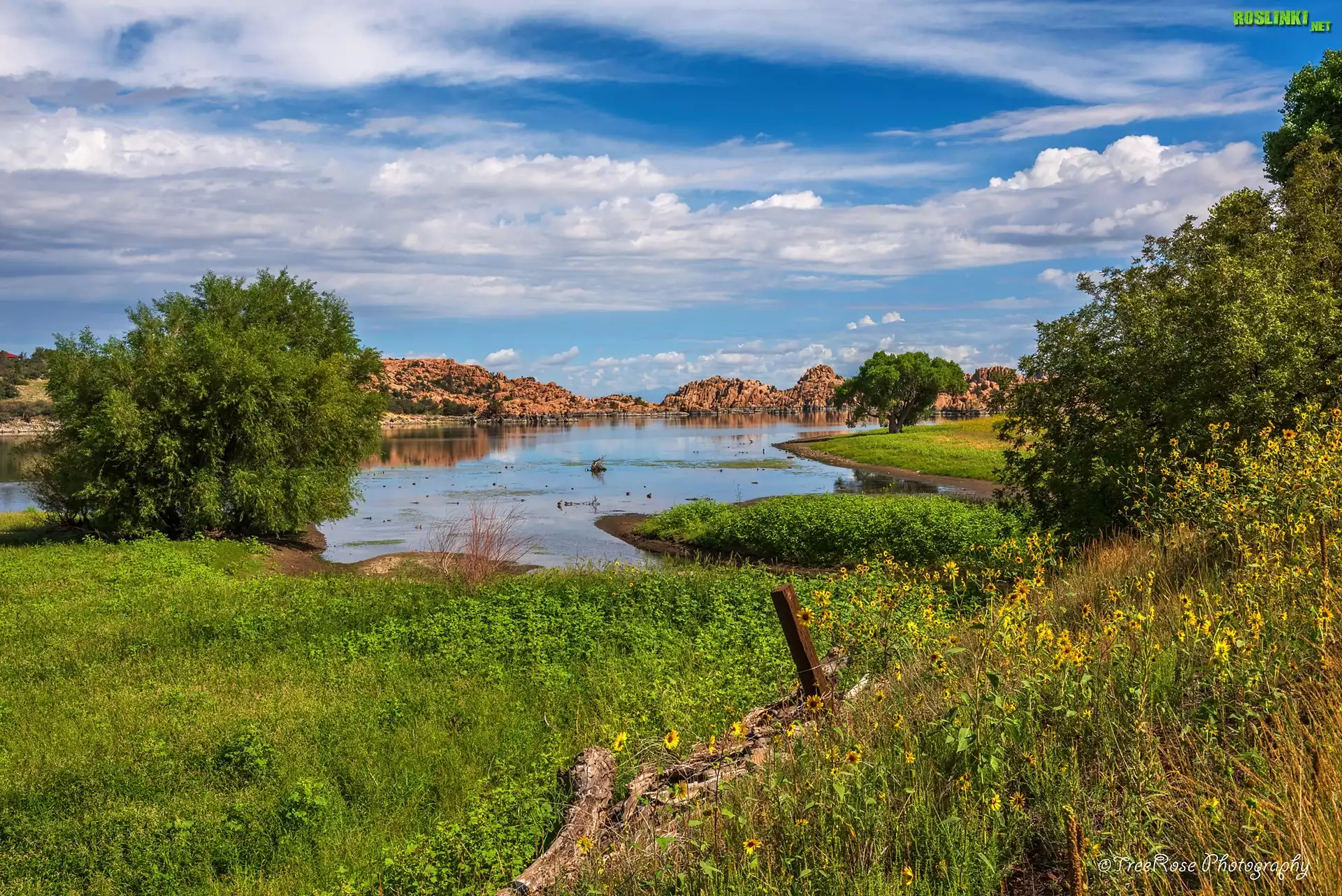 Rośliny: Jezioro, Watson Lake, Chmury, Skały, Drzewa, Łąka, Arizona, Stany Zjednoczone