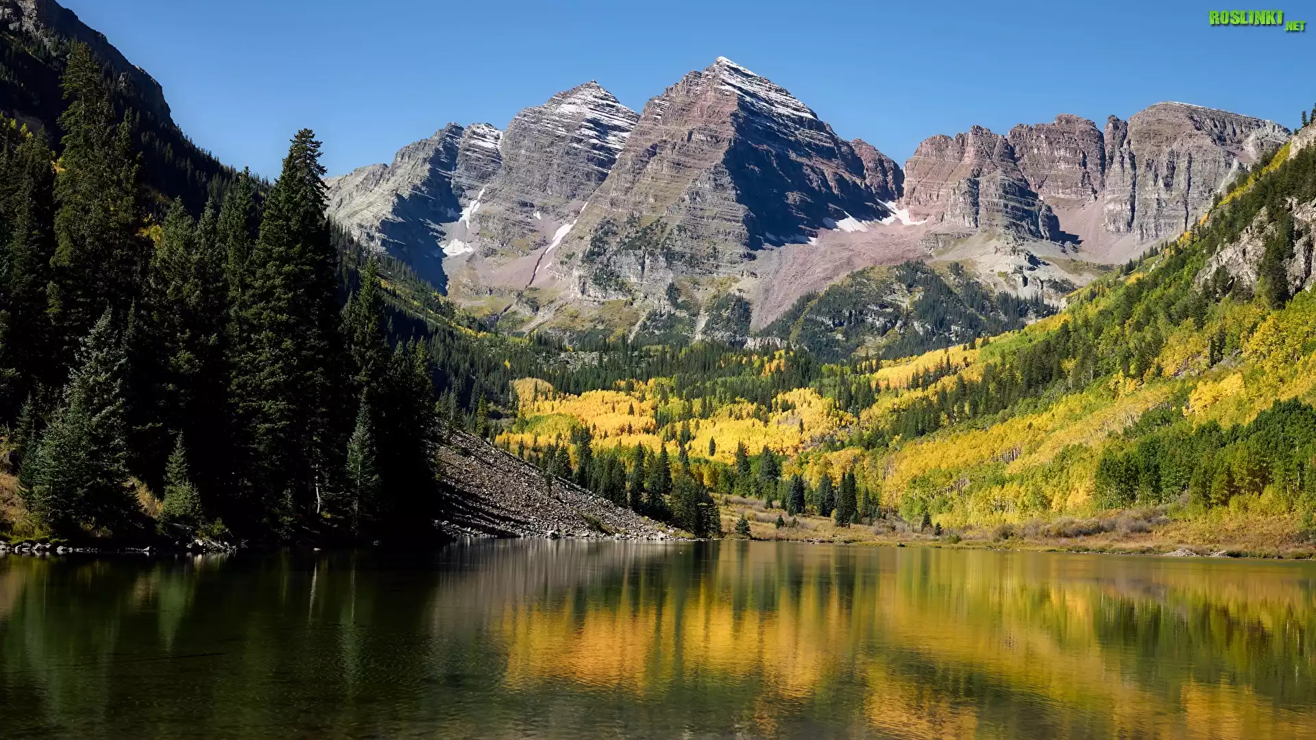 Jezioro Maroon Lake, Góry Skaliste, Góry Skaliste, Szczyty Maroon Bells, Drzewa, Drzewa, Kolorado, Stany Zjednoczone |