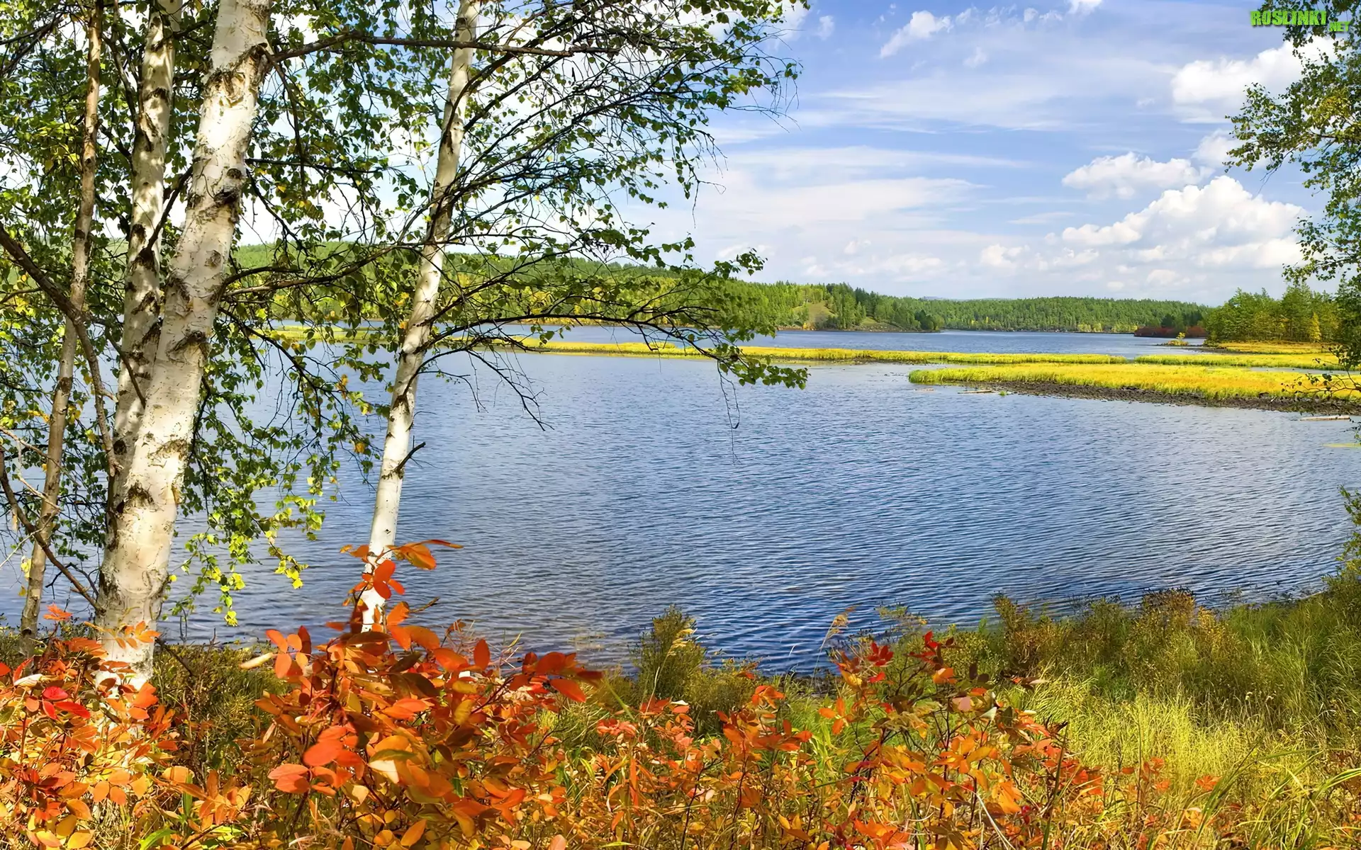 Rośliny: Jezioro, Brzozy, Jesienne, Liście, Suche, Trawy