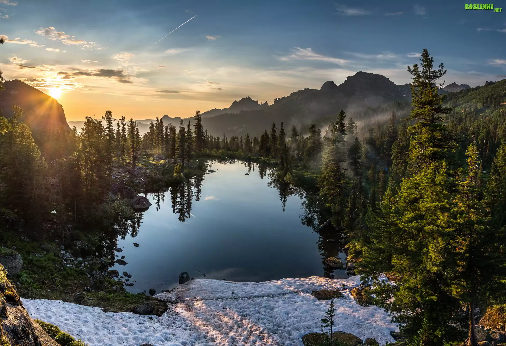 Jezioro Lazurnoye, Drzewa, Góry Ergaki, Pasmo Western Sayan, Zachód słońca, Park przyrody Ergaki, Syberia, Rosja |