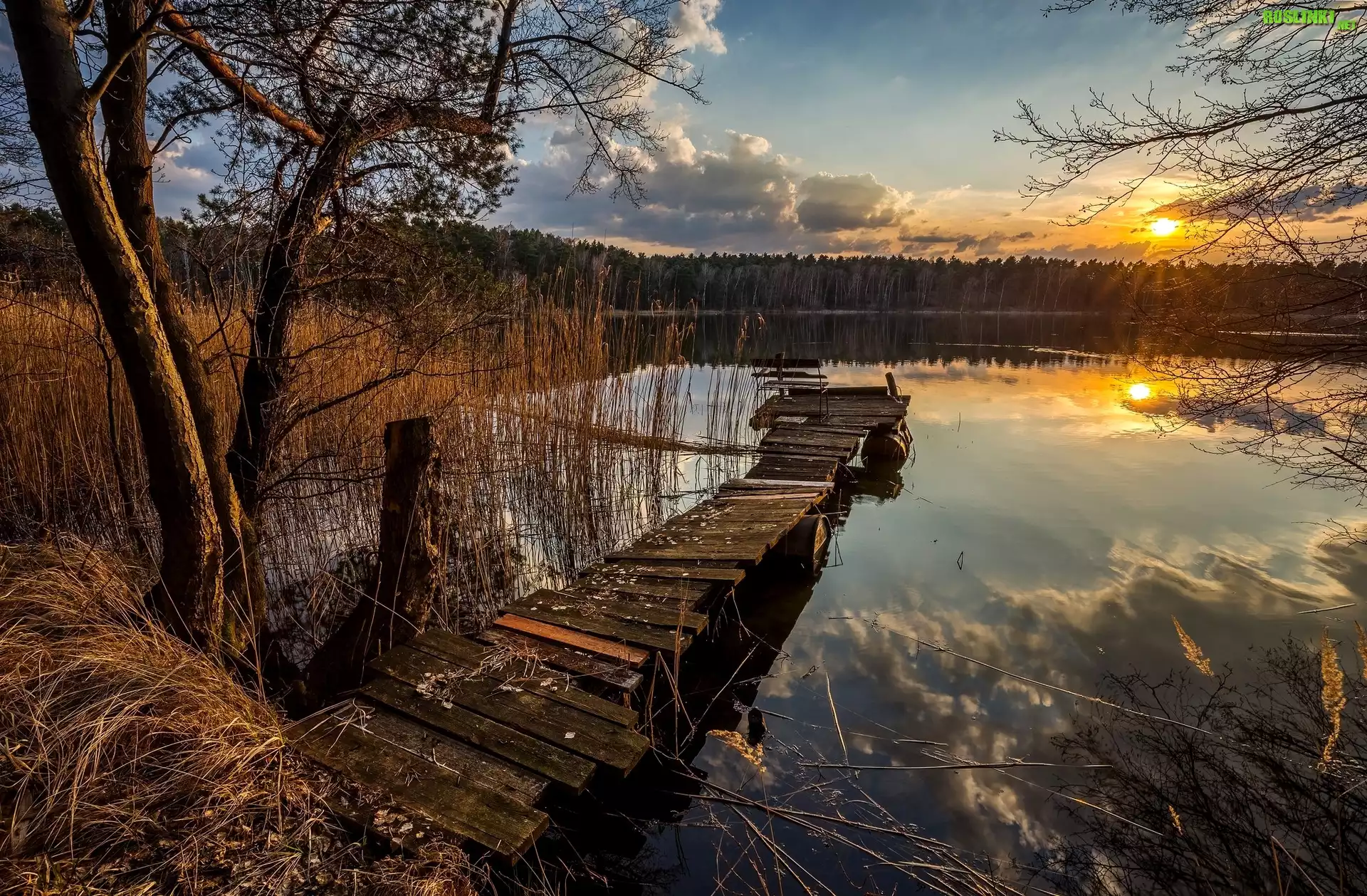 Rośliny: Jezioro, Zachód Słońca, Pomost, Szuwary, Drzewa