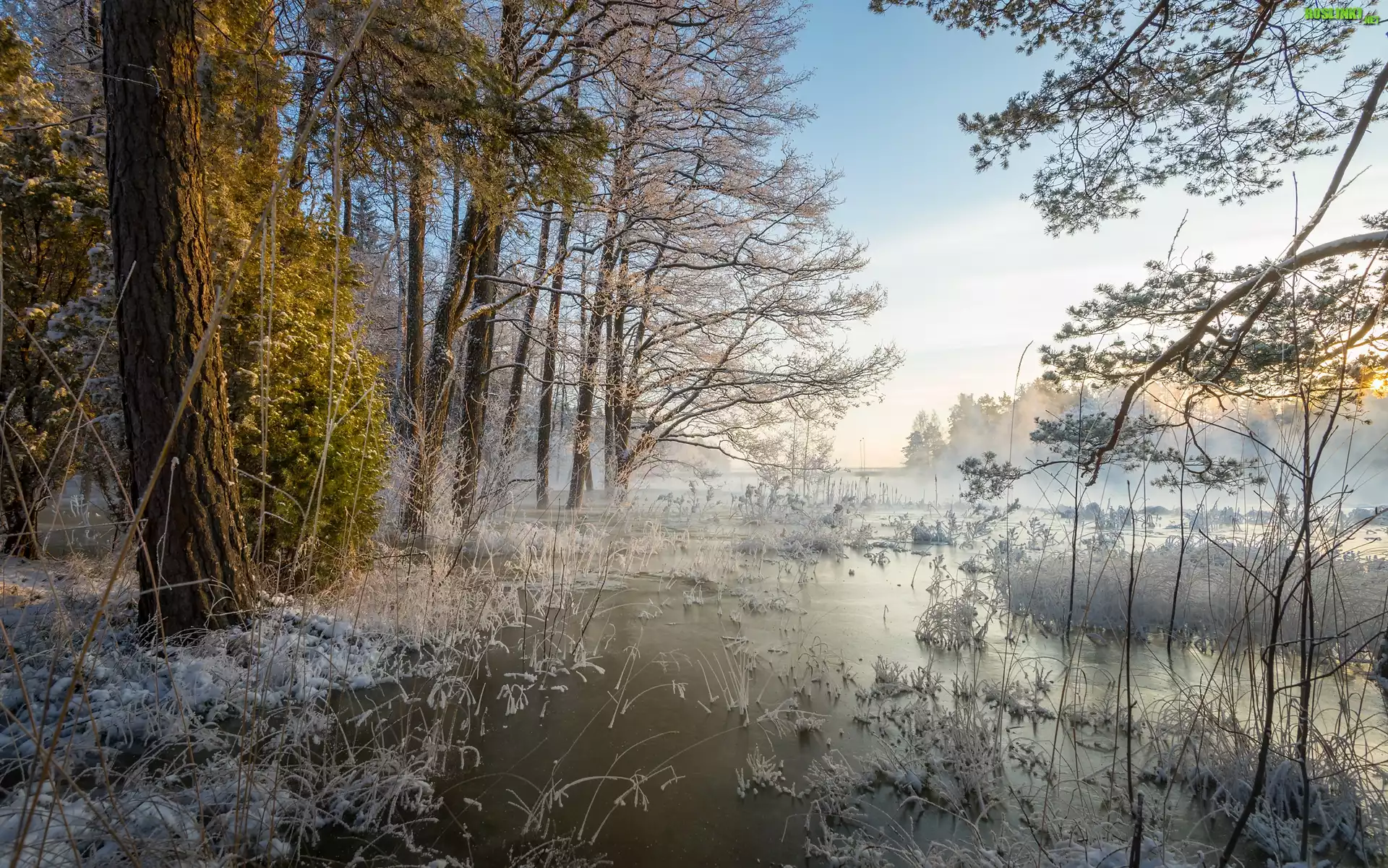 Rośliny: Jezioro, Drzewa, Szron, Przymrozek, Trawa, Mgła
