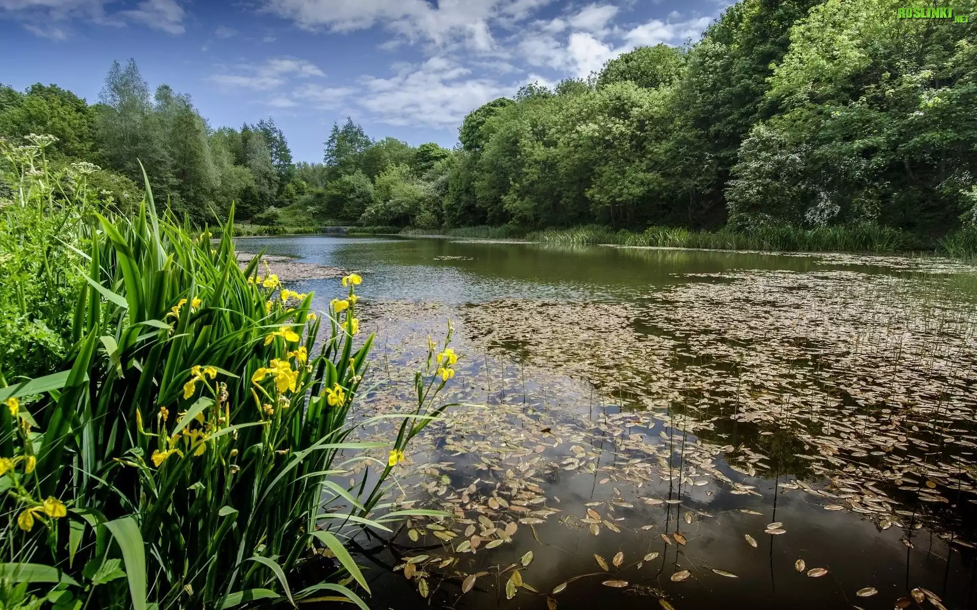 Rośliny: Lato, Jezioro, Opadłe, Liście, Drzewa, Kwiaty, Irysy wodne