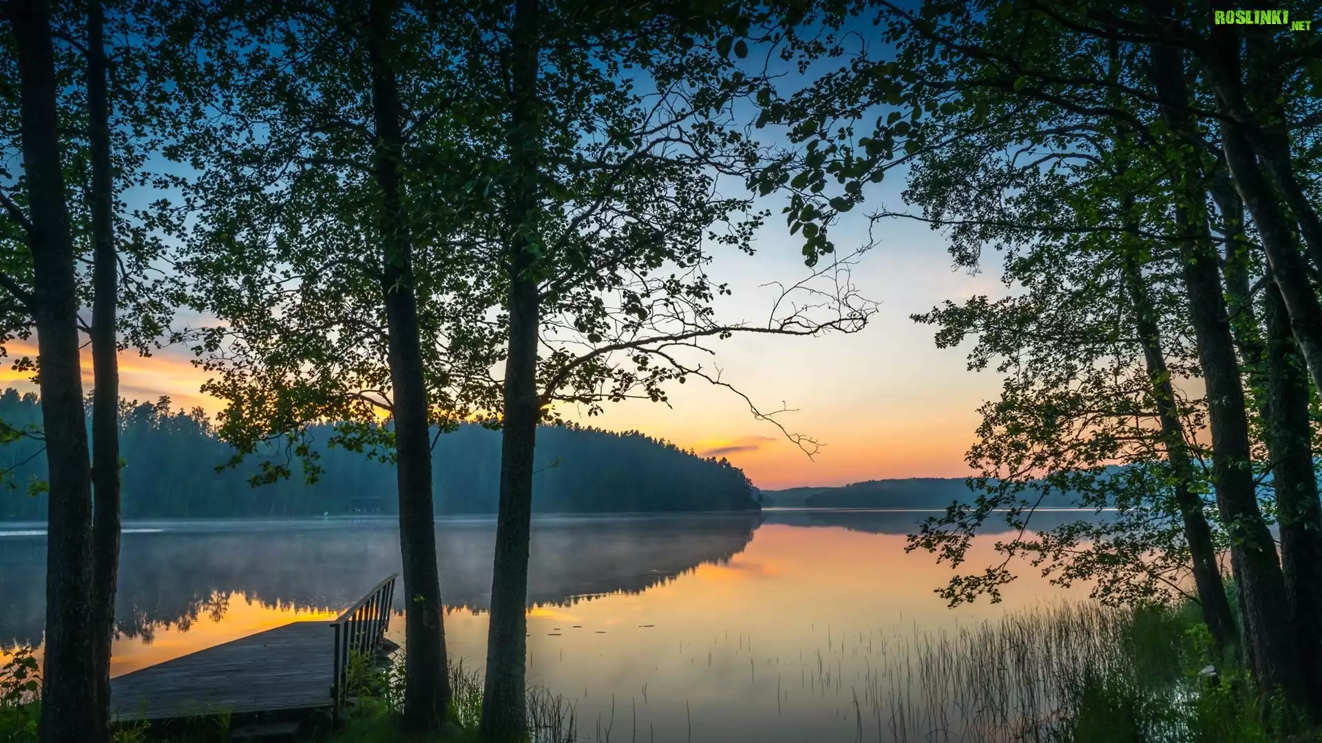 Rośliny: Jezioro, Pomost, Mgła, Drzewa, Wschód słońca