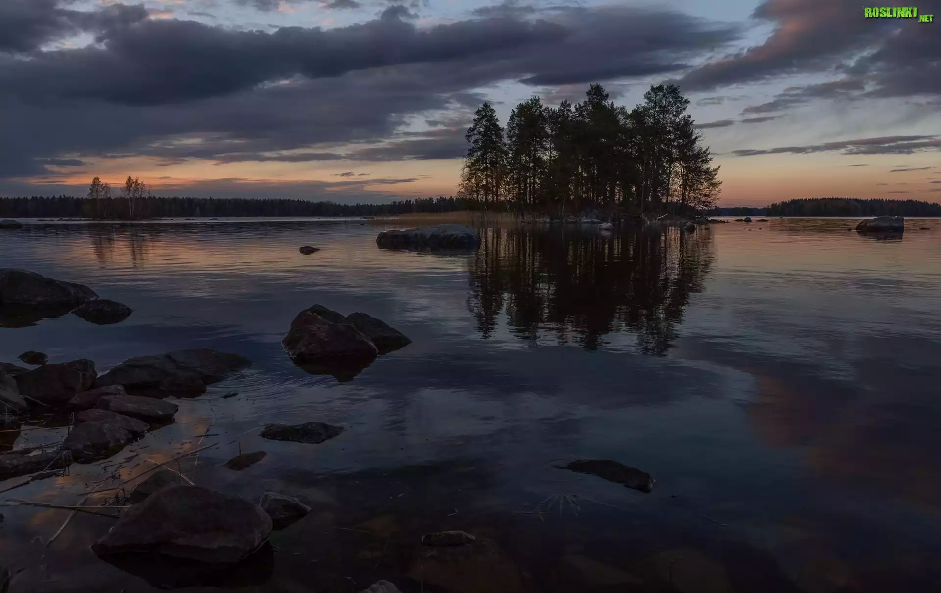Rośliny: Jezioro, Kamienie, Drzewa, Zachmurzone, Niebo