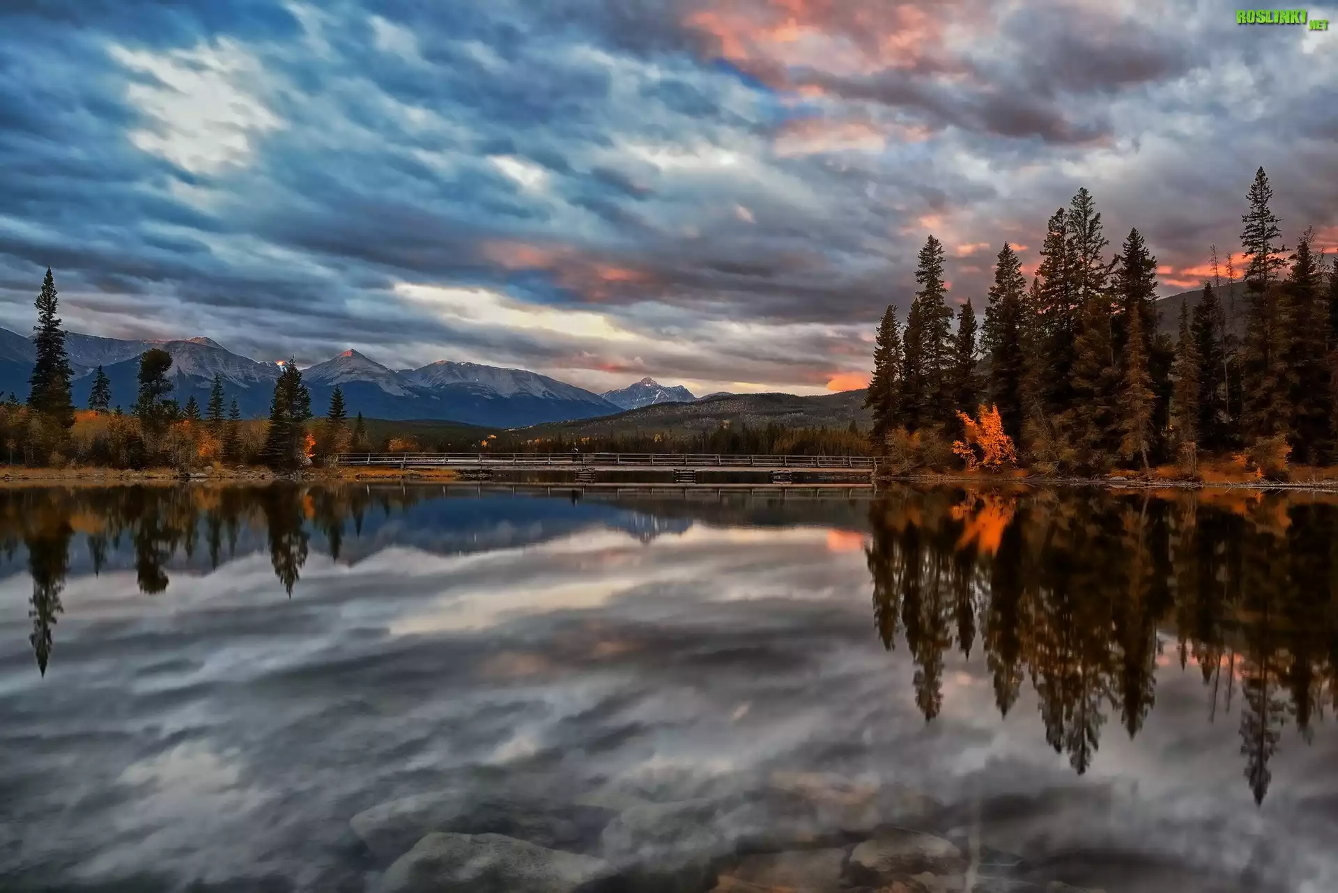 Rośliny: Jezioro, Drzewa, Góry, Zachmurzone, Niebo