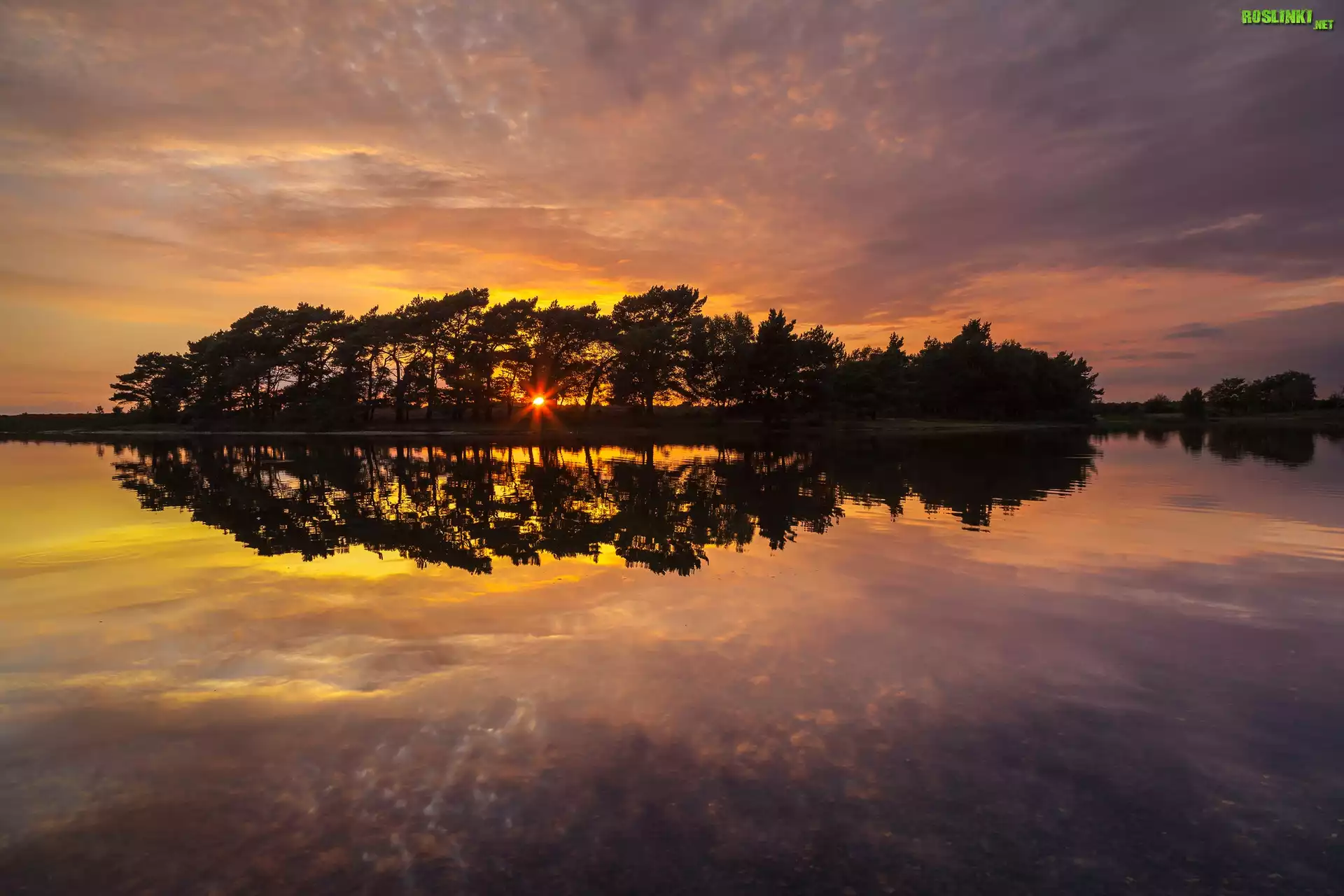 Rośliny: Jezioro, Drzewa, Zachód słońca