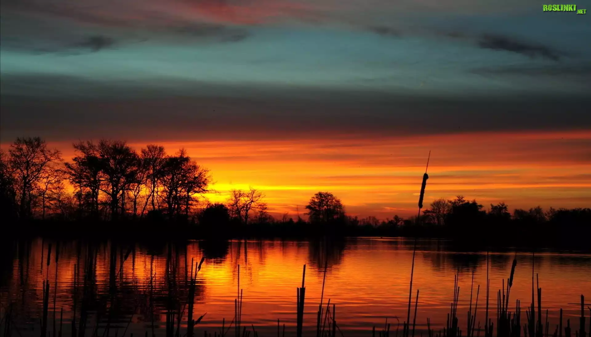Rośliny: Jezioro, Szuwary, Drzewa, Zachód Słońca